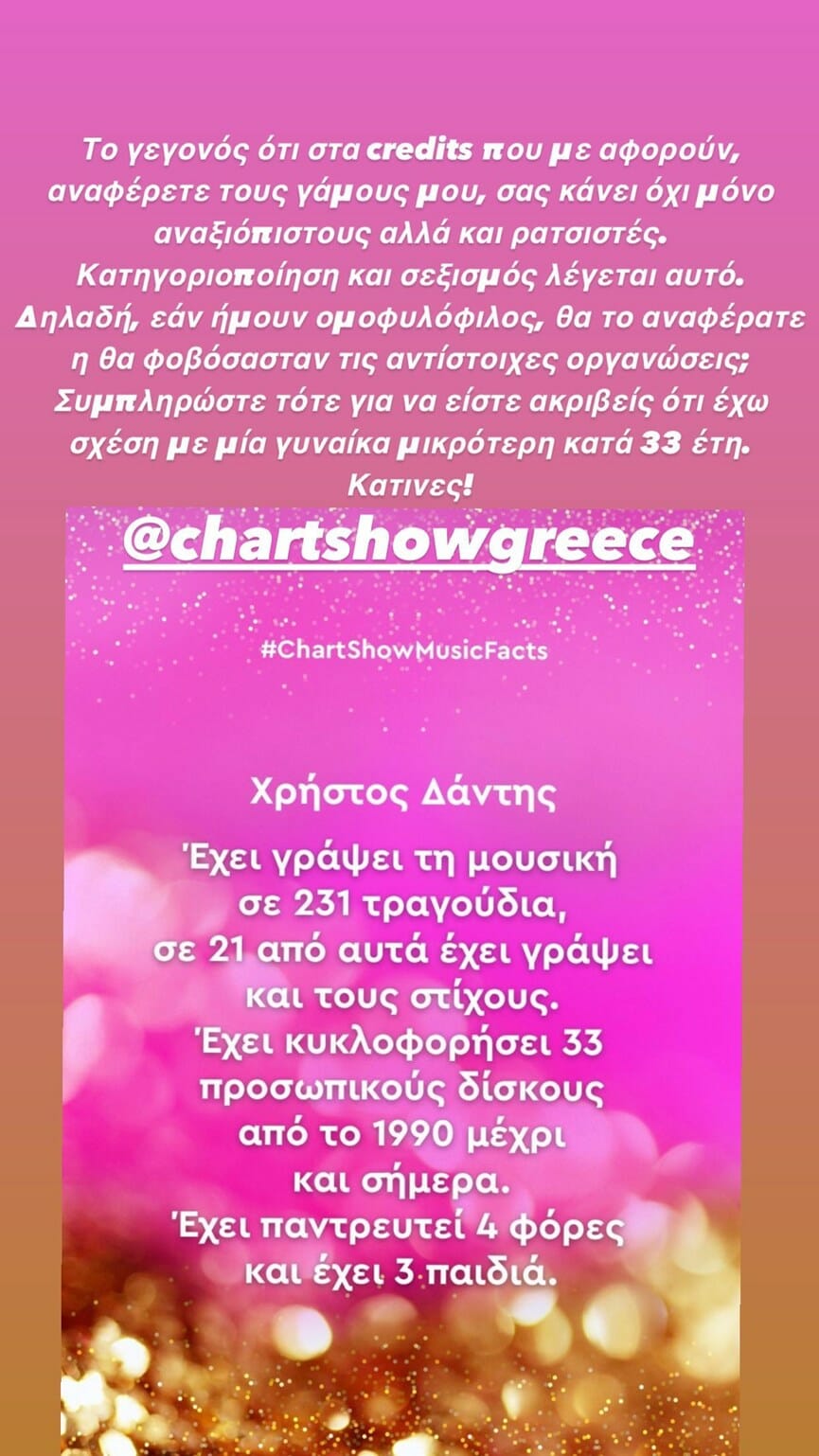 «Το γεγονός ότι στα credits που με αφορούν αναφέρετε τους γάμους μου, σας κάνει όχι μόνο αναξιόπιστους αλλά ρατσιστές. Κατηγοριοποίηση και ρατσισμός λέγεται αυτό. Δηλαδή, εάν ήμουν ομοφυλόφιλος, θα το αναφέρατε ή θα φοβόσασταν τις αντίστοιχες οργανώσεις; Συμπληρώστε τότε, για να είστε ακριβείς ότι έχω σχέση με μια γυναίκα μικρότερη κατά 33 έτη. Κατίνες», έγραψε χαρακτηριστικά ο Χρήστος Δάντης δηλώνοντας την αγανάκτησή του.