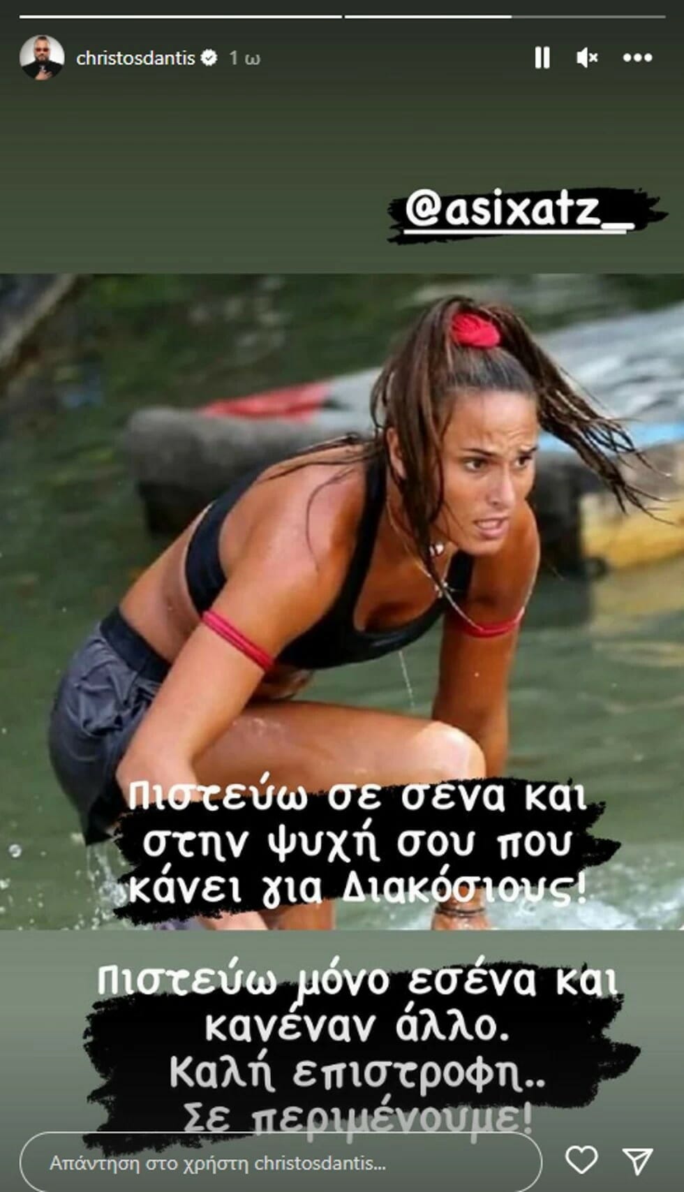 Η Ασημίνα Χατζηανδρέου αποβλήθηκε από το «Survivor All Star» και ο σύντροφός της, Χρήστος Δάντης έστειλε δημόσιο μήνυμα στήριξης προς την αγαπημένη του.