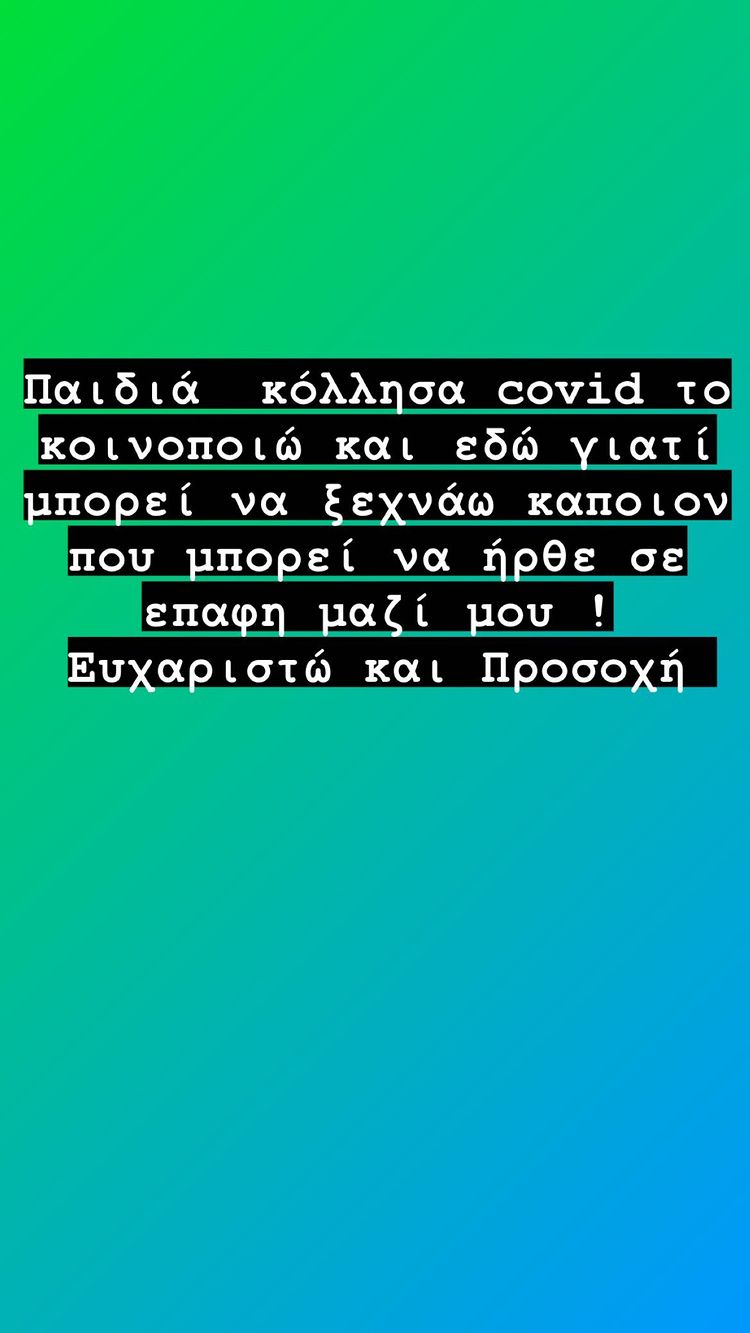 Ο ίδιος μέσα από ένα story του εξήγησε ότι νοσεί από κορονοϊό και ενημέρωσε όλους όσους ήρθαν σε επαφή μαζί του τις τελευταίες μέρες να κάνουν άμεσα τεστ.