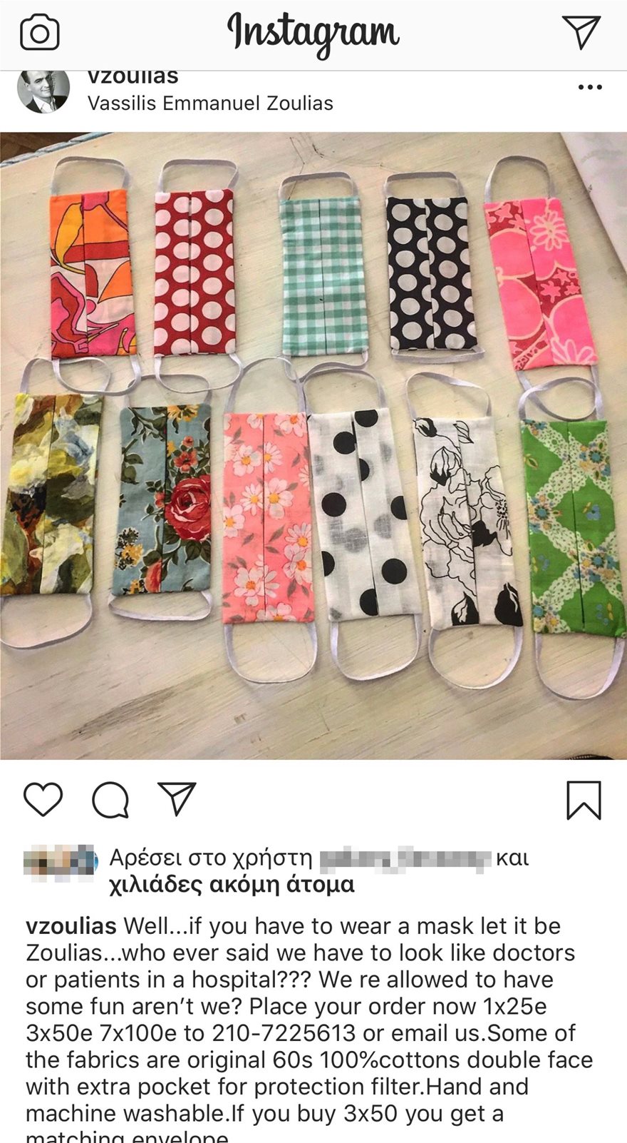 Μάσκες κατασκευασμένες από fabric scraps με μοτίβα των δεκαετιών ‘60 και ’70 που φέρουν την υπογραφή του σχεδιαστή, των οποίων η τιμή ξεκινά από 25 ευρώ. Συγχρονισμένος με τις απαιτήσεις της εποχής, ο σχεδιαστής Βασίλης Ζούλιας λάνσαρε στο διαδίκτυο μάσκες με την υπογραφή του. Εκμεταλλεύτηκε τα περισσεύματα υφασμάτων (ρετάλια) και έφτιαξε μάσκες που λανσάρει μέσω των λογαριασμών του στα μέσα κοινωνικής δικτύωσης, στους followers του. Μια κίνηση η οποία αν και σε γενικές γραμμές άρεσε και πολλοί έσπευσαν να παραγγείλουν, προκάλεσε και αντιδράσεις καθώς υπήρξαν και αυτοί που βρήκαν το ποσό ιδιαίτερα «τσουχτερό», αν αναλογιστεί κανείς ότι η τιμή μιας υφασμάτινης προστατευτικής μάσκας για τον Covid-19 ξεκινά από τα 2 ευρώ.