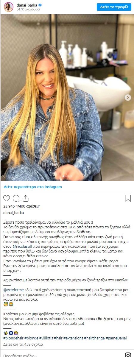 Πιο αναλυτικά, η Δανάη Μπάρκα δημοσίευσε μερικές νέες φωτογραφίες με το νέο look στα μαλλιά της και εξήγησε, πως η εν λόγω ανανέωση έχει να κάνει με μια αλλαγή που έχει συμβεί στην προσωπική της ζωή χωρίς να εξηγεί κάτι περεταίρω.