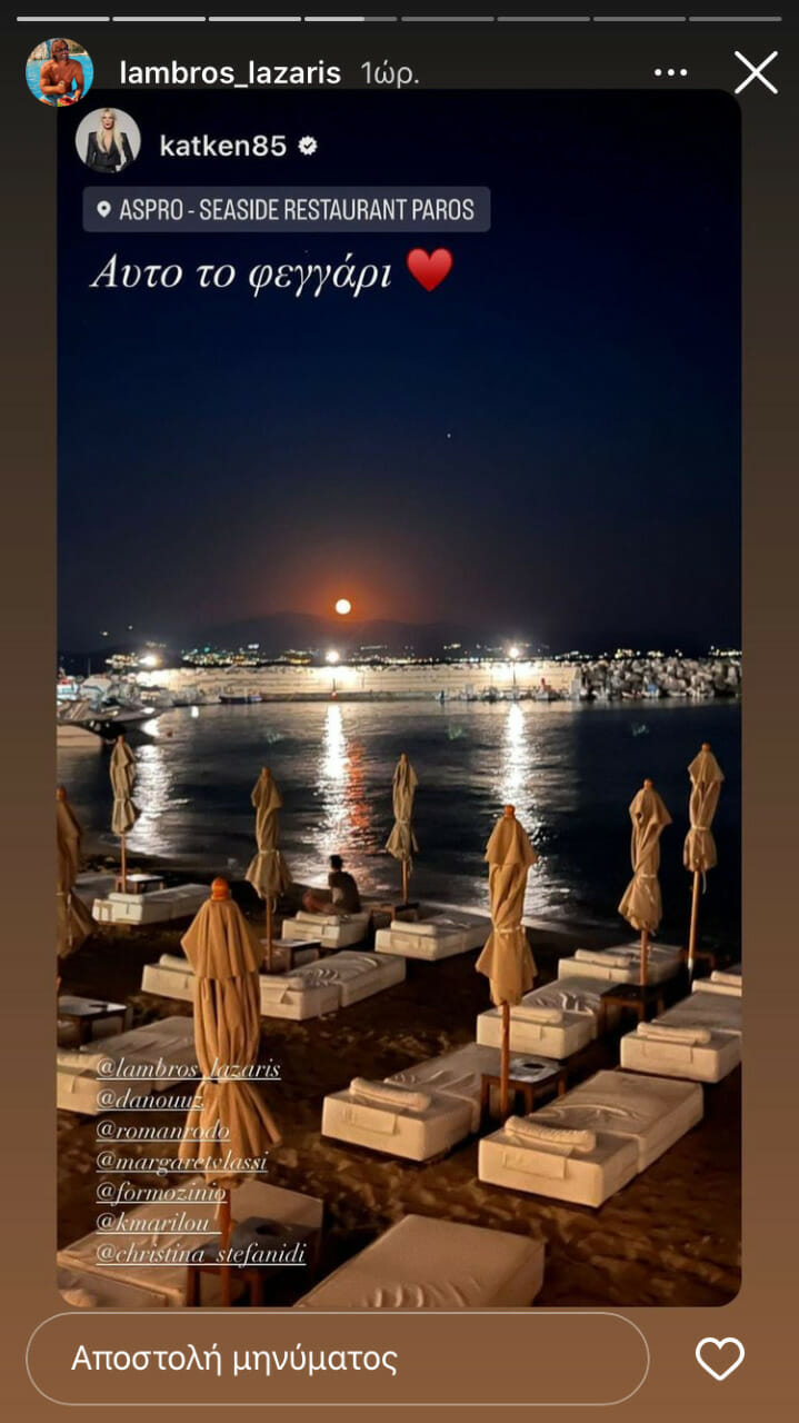 Οι δυο τους περνούν καλά με παρέα φίλων, ανάμεσα στους οποίους βρίσκεται και η Κατερίνα Καινούργιου, όπως φαίνεται και στις φωτογραφίες τους. Ενώ δεν έλειψαν από το πάρτι γενεθλίων του Λάκη Γαβαλά, όπου ξεφάντωσαν μέχρι το πρωΐ. Μάλιστα θα μείνουν και για τον Δεκαπενταύγουστο και την πολυαναμενόμενη συναυλία της Άννας Βίσση που θα ξεσηκώσει το νησί.