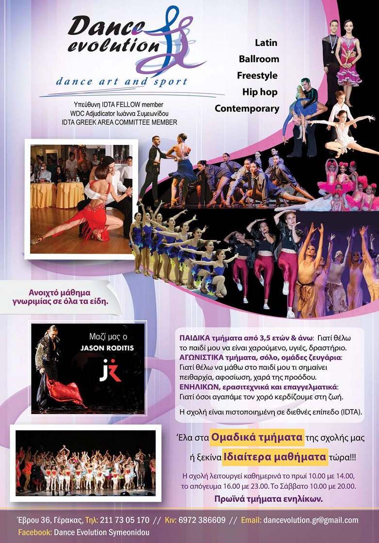 ΠΑΙΔΙΚΑ τμήματα από 3,5 ετών & άνω. Γιατί θέλω το παιδί μου να είναι χαρούμενο, υγιές, δραστήριο. ΑΓΩΝΙΣΤΙΚΑ τμήματα, σόλο, ομάδες ζευγάρια Γιατί θέλω να μάθω στο παιδί μου τι σημαίνει πειθαρχία, αφοσίωση, χαρά της προόδου. ΕΝΗΛΙΚΩΝ, ερασιτεχνικά και επαγγελματικά Γιατί όσοι αγαπάμε τον χορό κερδίζουμε στη ζωή.