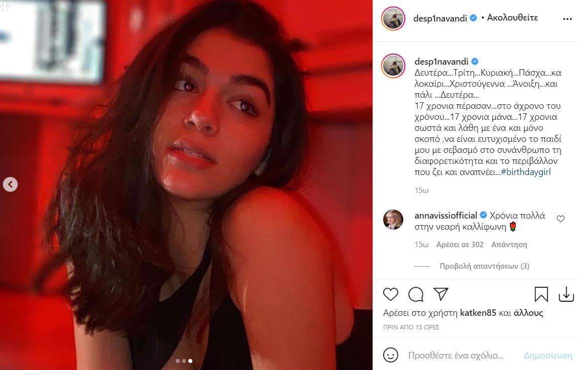 Στην ανάρτηση σχολίασε και η Άννα Βίσση, με την οποία πλέον η Δέσποινα έχει έρθει αρκετά κοντά μετά την ιστορική τους μουσική συνάντηση στο J2US. «Χρόνια πολλά στην νεαρή καλλίφωνη» έγραψε.