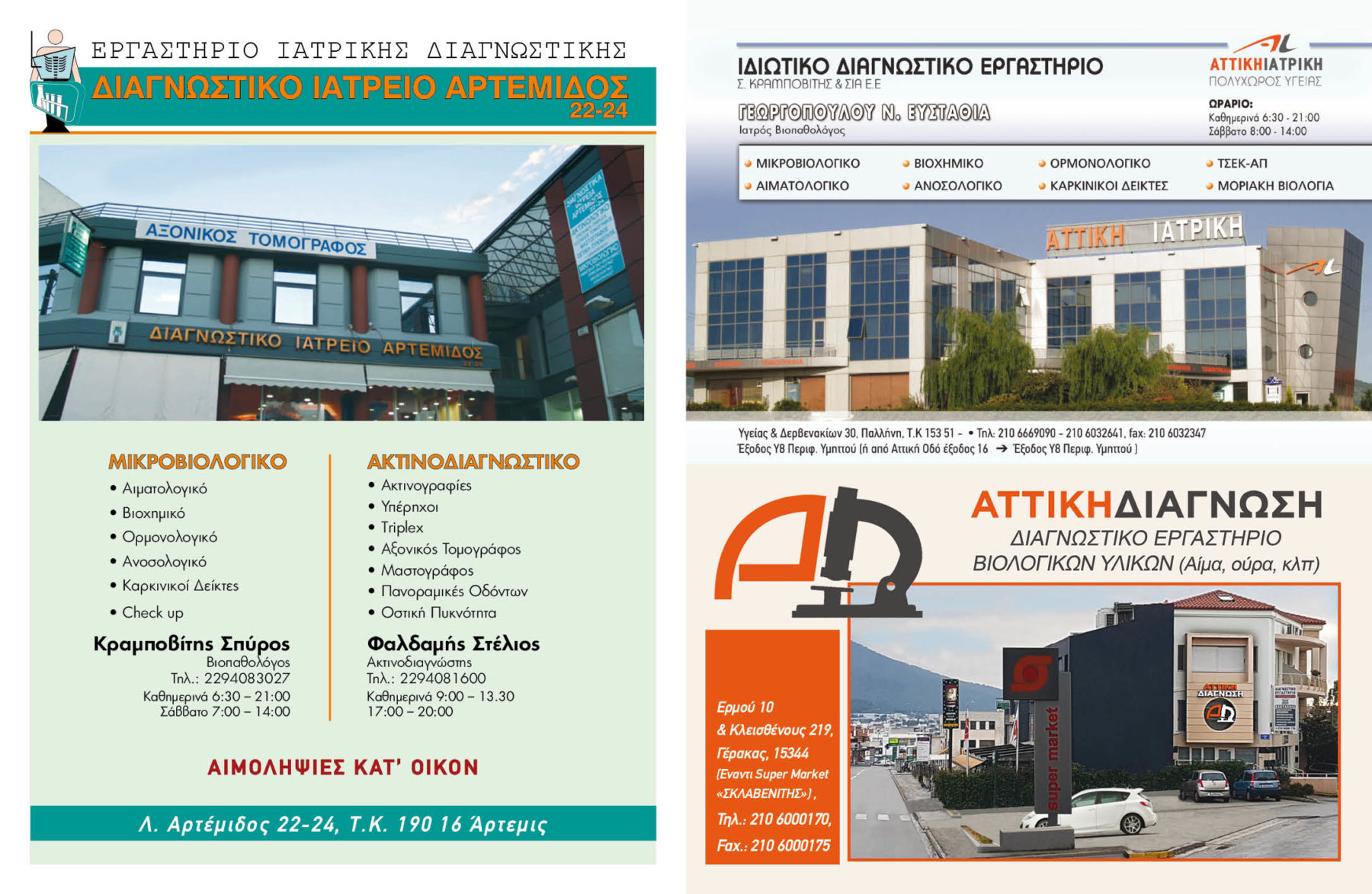 Επειδή η υγεία είναι πάνω από όλα πραγματοποιήστε εξετάσεις μικροβιολογικές, κάθε τύπου Check Up με συνέπεια, σοβαρότητα, αξιοπιστία κι αυστηρό επαγγελματισμό στο Διαγνωστικό Ιατρείο Αρτέμιδος υπό την καθοδήγηση του κυρίου Κραμποβίτη Σπύρου και του κυρίου Φαλδαμή Στέλιου. Εδώ μπορείτε να πραγματοποιήσετε μια πλειάδα εξετάσεων αιματολογικές, βιοχημικές αλλά και ακτινοδιαγνωστικές ενώ παράλληλα διατίθεται και αξονικός τομογράφος. Με γνώμονα τη συνεχή βελτίωση αλλά και την αγάπη προς τον άνθρωπο το διαγνωστικό ιατρείο Αρτέμιδος φροντίζει για το πιο πολύτιμο αγαθό αυτό της υγείας ενώ σας δίνει τη δυνατότητα και για αιμοληψίες κατοίκων. Εμπιστευτείτε ότι πολυτιμότερο έχετε στους καλύτερους κι αφήστε τους να σας φροντίσουν σαν δικούς τους ανθρώπους!