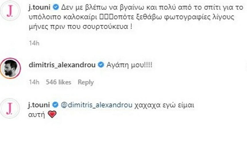 Παρά τα σχόλια και τις αντιδράσεις του στα social media μέχρι στιγμής κανένας από τους δύο δεν έχει ανεβάσει και είναι η φωτογραφία αφού το τελευταίο διάστημα ο Δημήτρης Αλεξάνδρου και η Ιωάννα Τούνη δείχνουν να βρίσκονται σε απόσταση χωρίς όμως κανένας από τους δύο να το έχει παραδεχτεί
