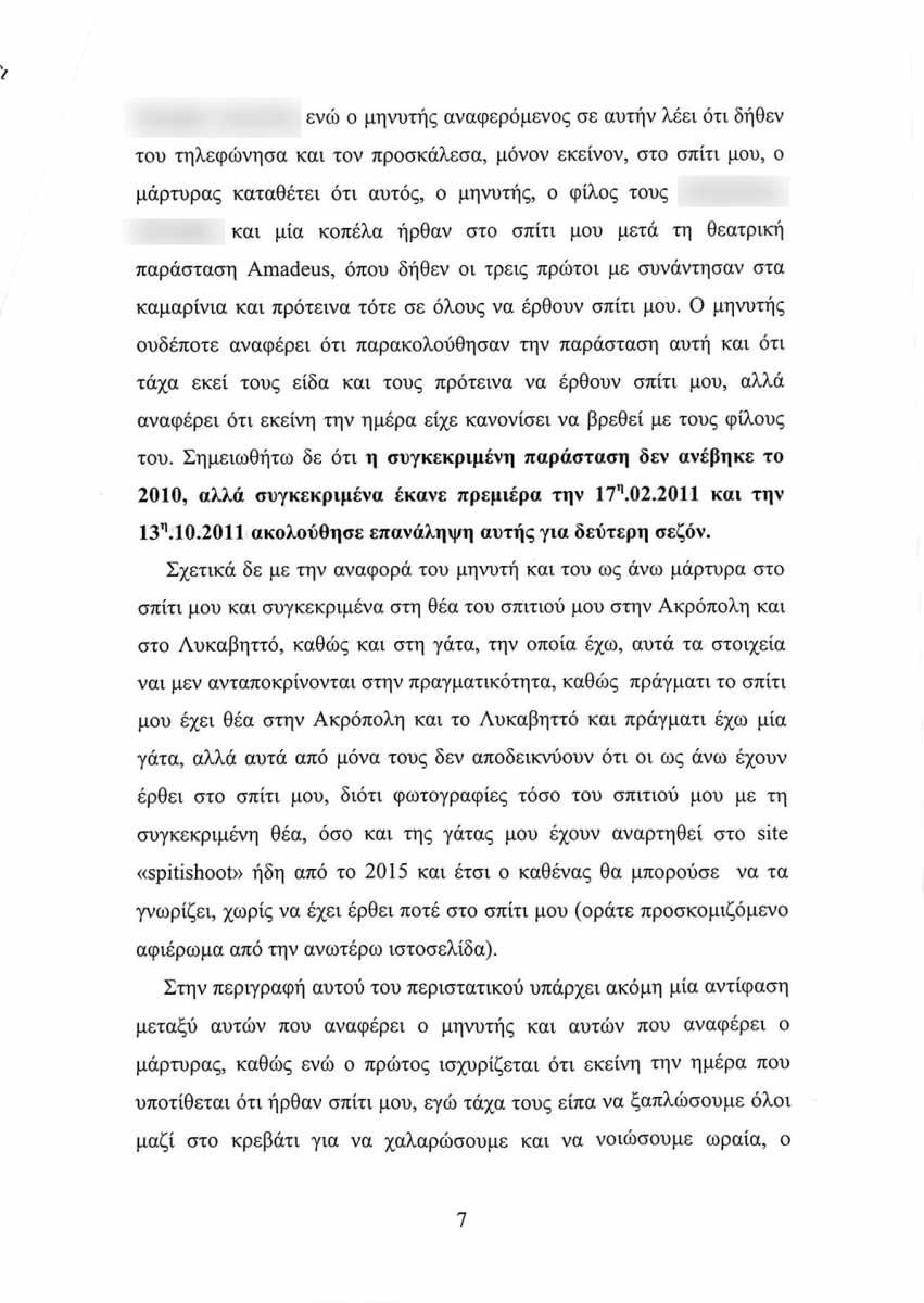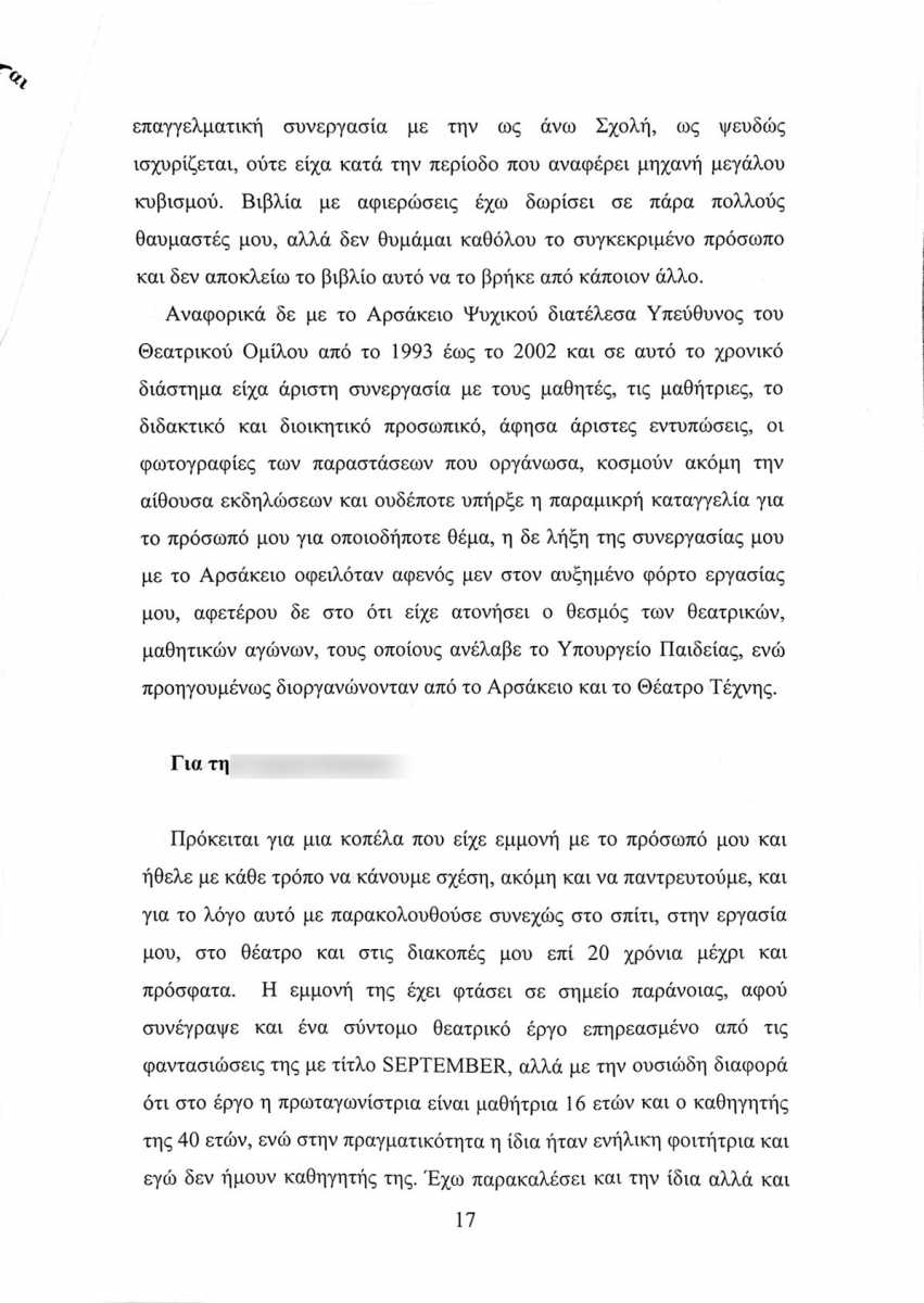 Αναφέρεται λεπτομερώς στα πρόσωπα τα οποία τον καταγγέλλουν και στην συνέχεια παραθέτει το βιογραφικό του και το έργο του στο Εθνικό Θέατρο.