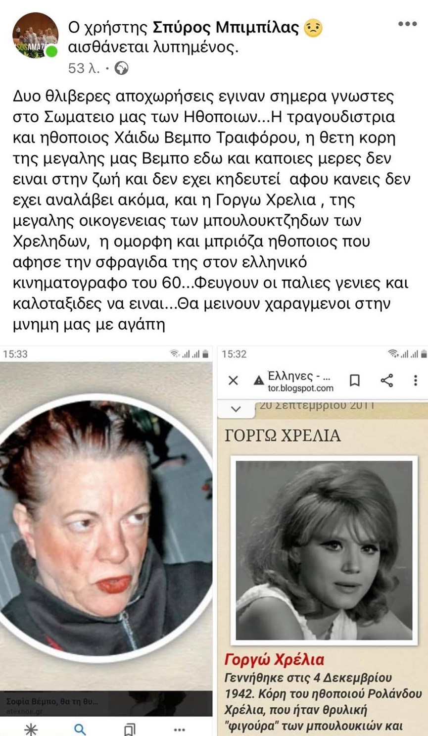 Πενθεί ο καλλιτεχνικός χώρος από την ξαφνική διπλή απώλεια. Έφυγε από τη ζωή η θετή κόρης της Σοφίας Βέμπο και του Μίμη Τραϊφόρου, Χάιδω, όμως ακόμα δεν έχει κηδευτεί καθώς δεν έχει αναλάβει κάποιος να κινήσει τις διαδικασίες. Την είδηση του θανάτου γνωστοποίησε ο Σπύρος Μπιμπίλας με μια ανάρτηση του στον προσωπικό του λογαριασμό στο Facebook. Παράλληλα, ο ηθοποιός ανακοίνωσε και μια ακόμα απώλεια, αυτή της ηθοποιού, Γοργούς Χρέλια. «Δυο θλιβερές αποχωρήσεις έγιναν σήμερα γνωστές στο Σωματείο μας των Ηθοποιών…Η τραγουδίστρια και ηθοποιός Χάιδω Βέμπο Τραϊφόρου, η θετή κόρη της μεγάλης μας Βέμπο εδώ και κάποιες μέρες δεν είναι στην ζωή και δεν έχει κηδευτεί αφού κάνεις δεν έχει αναλάβει ακόμα, και η Γοργώ Χρέλια , της μεγάλης οικογένειας των μπουλουκτζήδων των Χρέληδων, η όμορφη και μπριόζα ηθοποιός που άφησε την σφραγίδα της στον ελληνικό κινηματογράφο του 60…Φεύγουν οι παλιές γενιές και καλοτάξιδες να είναι…Θα μείνουν χαραγμένοι στην μνήμη μας με αγάπη», έγραψε ο Σπύρος Μπιμπίλας στην ανάρτηση του.
