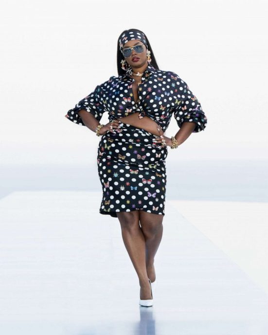 Το φαινομενικό duo άνοιξε το show με ένα μάλλον κλασικό ροζ κοστούμι Versace, κομμένο με τρία κουμπιά και τσέπες, προτού ανεβάσουν αμέσως την ένταση με μια mini φούστα και ένα bustier top.