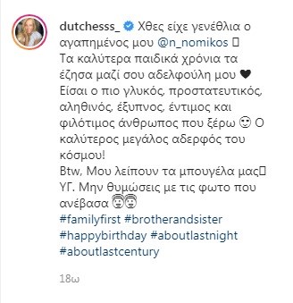 “Χθες είχε γενέθλια ο αγαπημένος μου @n_nomikos Τα καλύτερα παιδικά χρόνια τα έζησα μαζί σου αδελφούλη μου. Είσαι ο πιο γλυκός, προστατευτικός, αληθινός, έξυπνος, έντιμος και φιλότιμος άνθρωπος που ξέρω. Ο καλύτερος μεγάλος αδερφός του κόσμου! Btw, Μου λείπουν τα μπουγέλα μας. ΥΓ. Μην θυμώσεις με τις φωτο που ανέβασα”.
