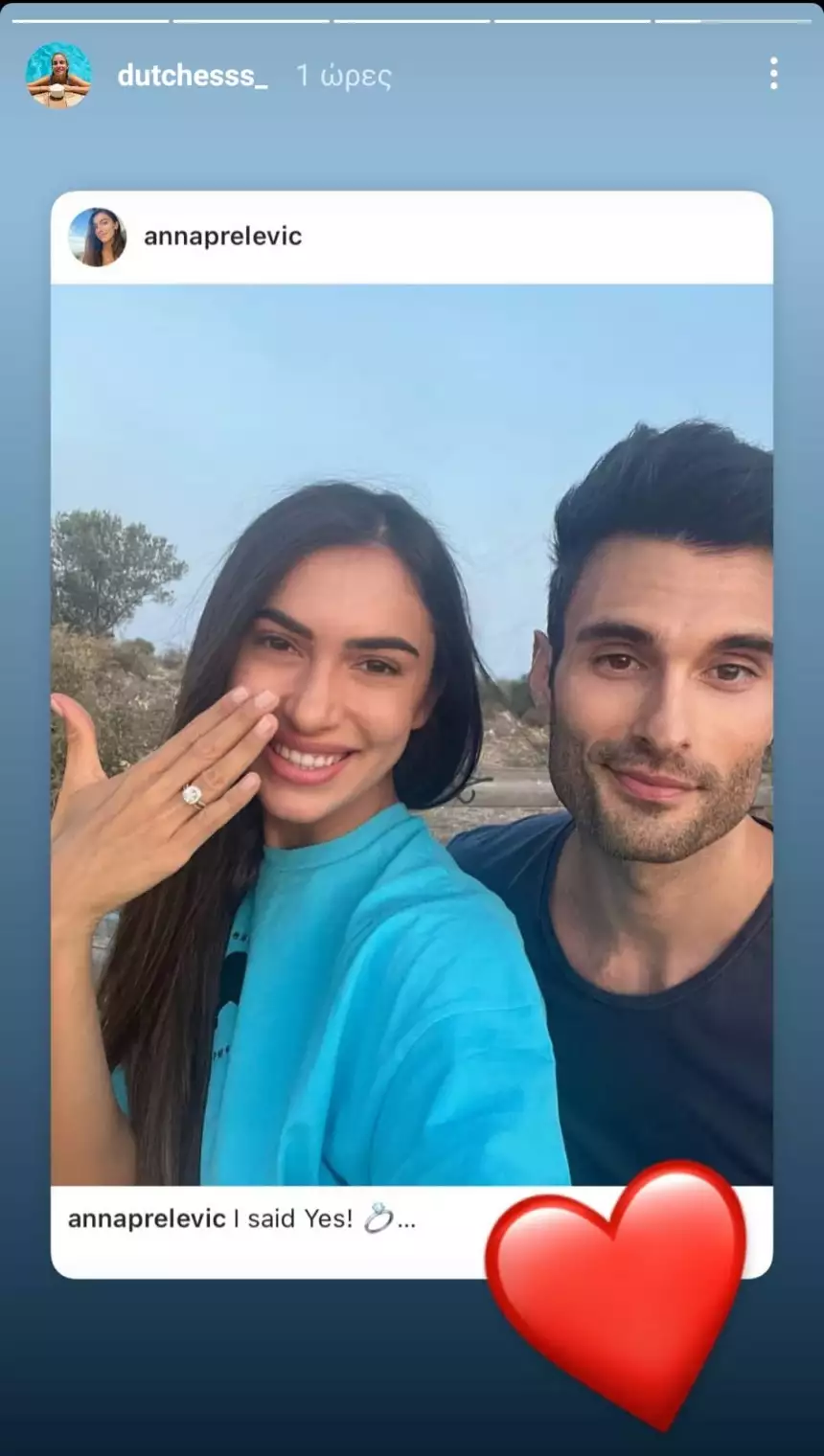 Η Δούκισσα Νομικού, έκανε ενα repost την ανάρτηση της Άννας Πρέλεβιτς στα social media, βάζοντας μια καρδούλα και δείχνοντας έτσι πόσο χαίρεται για την ευτυχία του ζευγαριού!