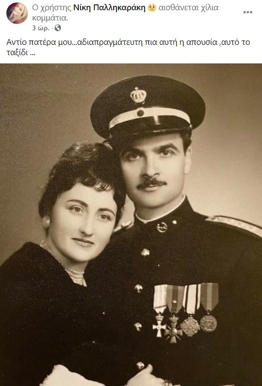 Συγκεκριμένα η Νίκη Παλληκαράκη δημοσίευσε μια φωτογραφία των γονιών της και έγραψε: «Αντίο πατέρα μου…αδιαπραγμάτευτη πια αυτή η απουσία ,αυτό το ταξίδι …».