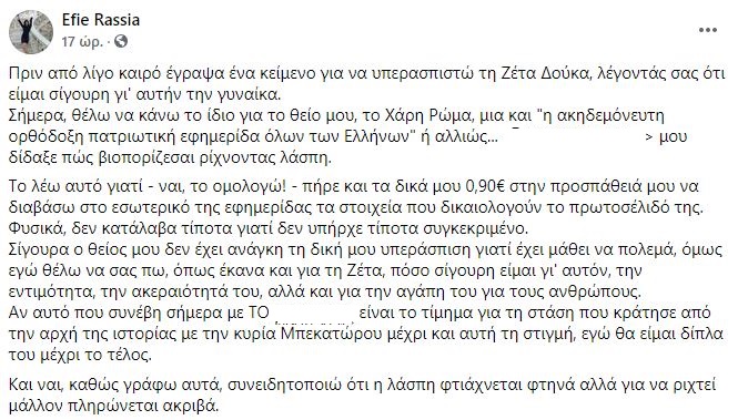 Το ξέσπασμα της Έφης Ρασσιά, ανιψιάς του Χάρη Ρώμα, προκάλεσε δημοσίευμα καθημερινής εφημερίδας που έκανε λόγο ότι σύντομα ο ηθοποιός θα δεχτεί καταγγελίες.