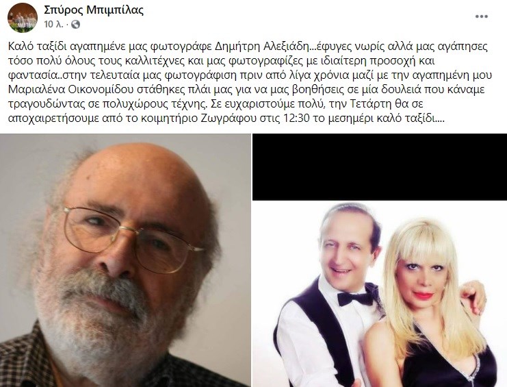 Τη δυσάρεστη είδηση του θανάτου του Δημήτρη Αλεξιάδη γνωστοποίησε ο Σπύρος Μπιμπίλας μέσα από τον προσωπικό του λογαριασμό στο Facebook.