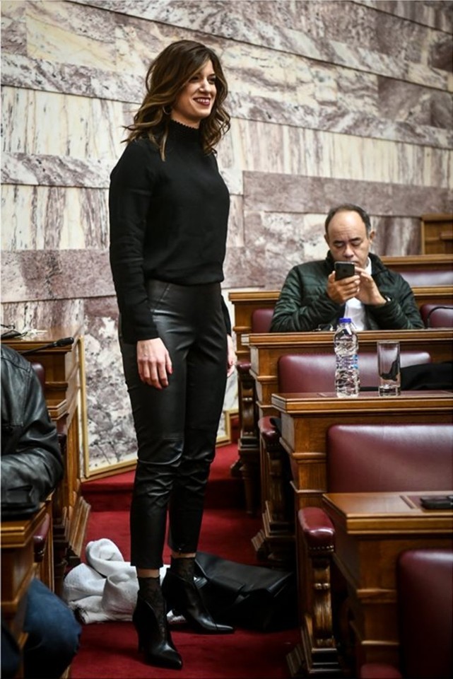 Μόνο απαρατήρητη δεν περνάει η Κατερίνα Νοτοπούλου στα έδρανα της Βουλής. Σύμφωνα και με τον αντρικό πληθισμό, είναι αναμφισβήτητα μια από τις ωραιότερες παρουσίες στην ελληνική Βουλή. Πρόσφατα λοιπόν με το εντυπωσιακό look της στην αίθουσα της Γερουσίας όπου συνεδρίασε η Κοινοβουλευτική Ομάδα του Σύριζα, όσο κι αν ηθελε να περασει απαρατήρητη έγινε το αντίθετο.Κι αυτό γιατί επέλεξε να φορέσει ένα κατάμαυρο πουλόβερ ζιβάγκο, ένα δερμάτινο μαύρο παντελόνι και ένα εντυπωσιακό ζευγάρι ankle boots από τα οποία ξεπηδούσαν δύο δαντελένιες μαύρες κάλτσες.