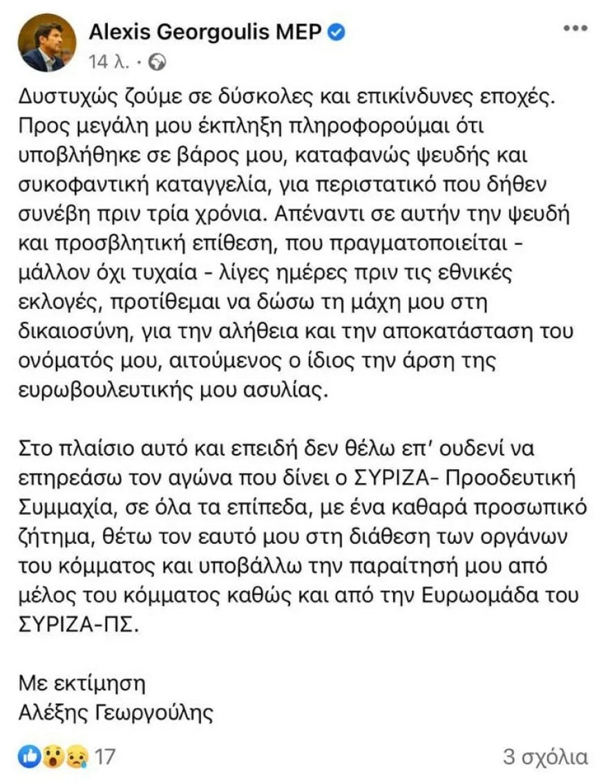 «Ο ευρωβουλευτής Αλέξης Γεωργούλης τίθεται εκτός ΣΥΡΙΖΑ-ΠΣ, σε συνέχεια της ενημέρωσης που ειχαμε σήμερα για καταγγελία εις βάρος του και δεδομένης της ανάγκης να διαλευκανθεί πληρως η σχετική υπόθεση».