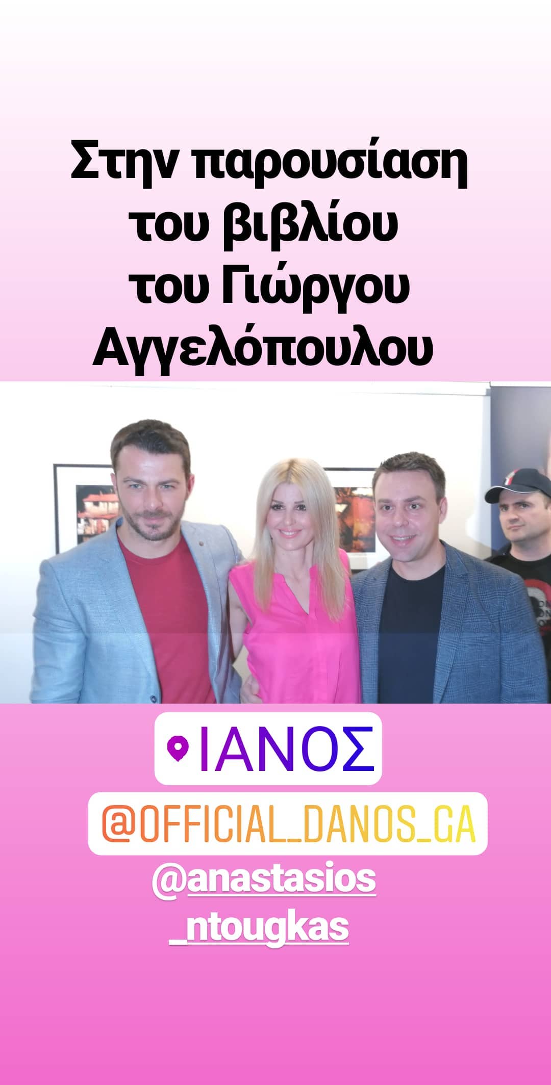 Σε μια όμορφη συνάντηση στο βιβλιοπωλείο ΙΑΝΟΣ μίλησα για το βιογραφικό αφήγημα του Γιώργου Αγγελόπουλου, του Ντάνου. Διαβάζοντας το δεν είδα μόνο τη ζωή του, αλλά και την ψυχή του. Υπάρχουν πράγματα που τον κάνουν ξεχωριστό. Η προσήλωση στους στόχους που βάζει, με ή χωρίς έπαθλο. Το πάθος του για τη ζωή. Σε μια εποχή που συχνά χάνεται η ουσία των πραγμάτων, το αφήγημα του Γιώργου, μας θυμίζει πως στη ζωή τα όμορφα πράγματα είναι τα απλά. Η ταπεινότητα, το μέτρο, η δύναμη να πέφτεις και να σηκώνεσαι. Η τόλμη να βλέπεις τα πράγματα κατάματα και να μην δειλιάζεις. Ο αγώνας να καταθέτεις το εγώ σου για κάτι σπουδαιότερο. Ο Ντανος δείχνει σε όλους πόσο κοντά στην πραγματικότητα είναι το όνειρο. Αλλά και πόσο χαμηλά πρέπει να πετάς, όταν φυσάει ο άνεμος της επιτυχίας. Ξεχώρισα από το βιβλίο του την ιδιαίτερη σχέση του με τον Θεό. Την ανάγκη του να βαδίζει σε αυτό το δρόμο που τον έφερε μέχρι εδώ»!
