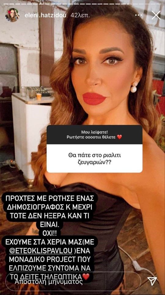 Η Ελένη Χατζίδου είναι ιδιαίτερα ενεργή στα social media και συχνά ζητάει από τους διαδικτυακούς της φίλους να της κάνουν ερωτήσεις. Με αφορμή λοιπόν το νέο ριάλιτι του Alpha «Battle of the couples» όπου θα συμμετέχουν 12 ζευγάρια, δημοσιεύματα θέλουν ανάμεσα τους να βρίσκονται και ζευγάρια της showbiz. Έτσι λοιπόν ένα από τα ερωτήματα που έθεσαν στην τραγουδίστρια, ήταν αν θα συμμετάσχει στο νέο παιχνίδι ζευγαριών μαζί με τον σύζυγό της Ετεοκλή Παύλου.