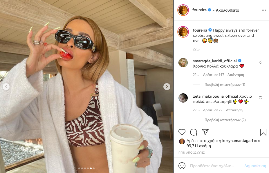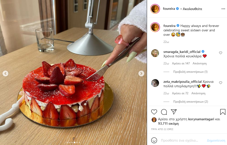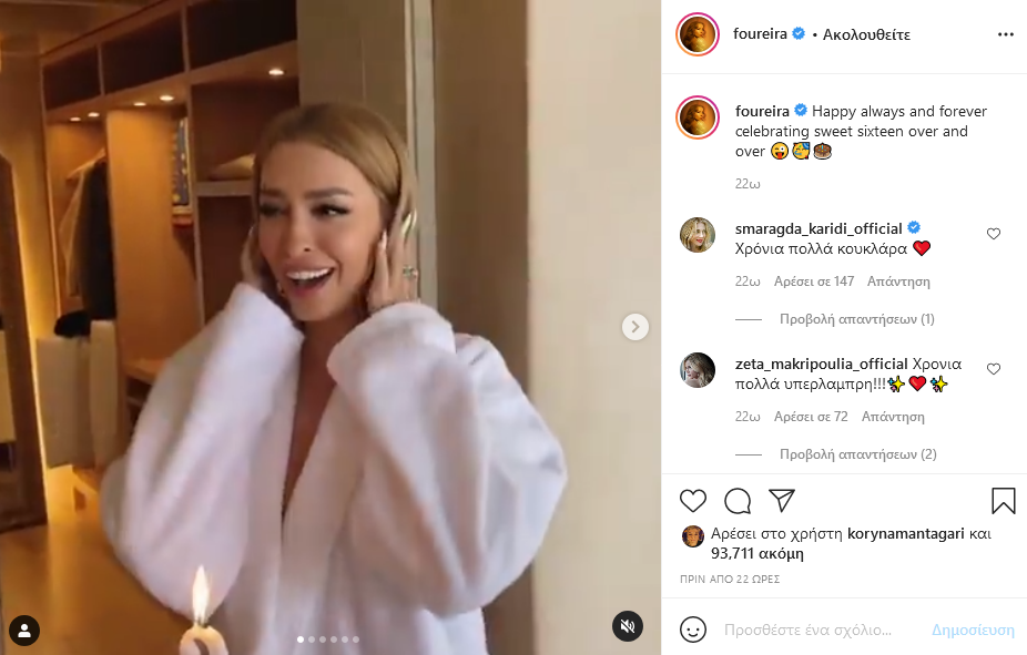 «Πάντα να γιορτάζω τα 16 μου χρόνια, ξανά και ξανά», έγραψε στο προφίλ της στο Instagram η Ελένη Φουρέιρα και ανέβασε φωτογραφίες και video από την έκπληξη που της έκαναν στα φετινά γενέθλιά της.