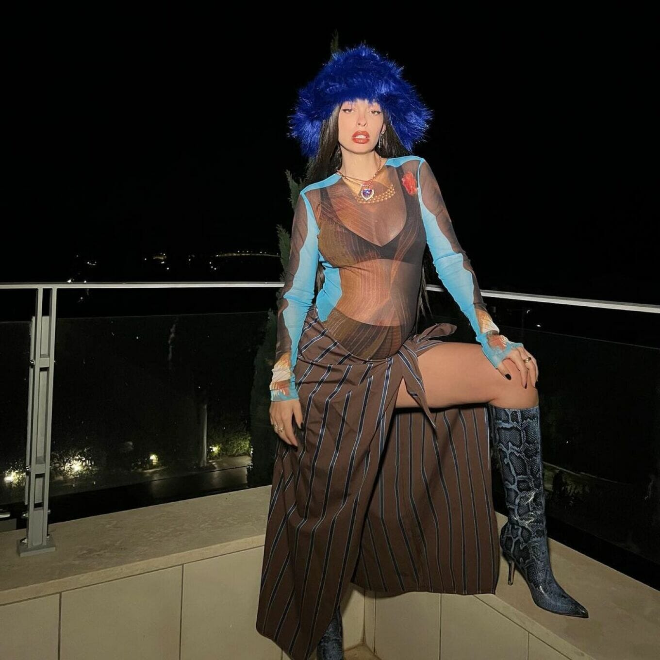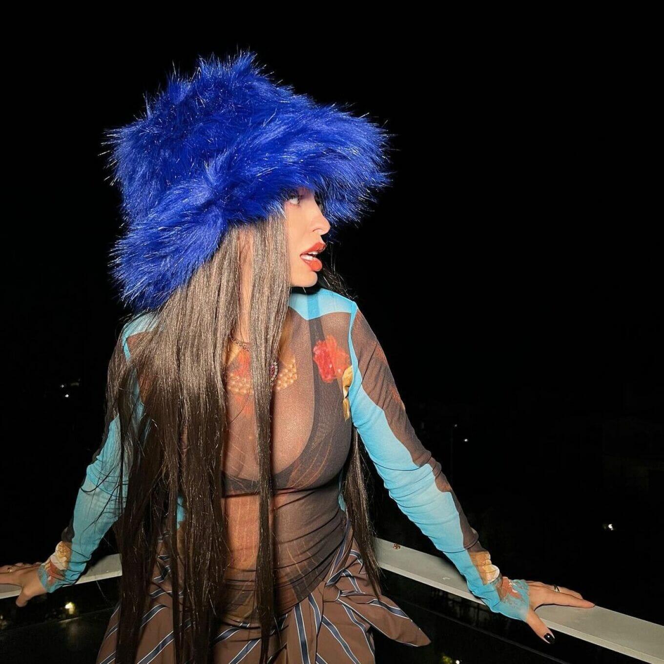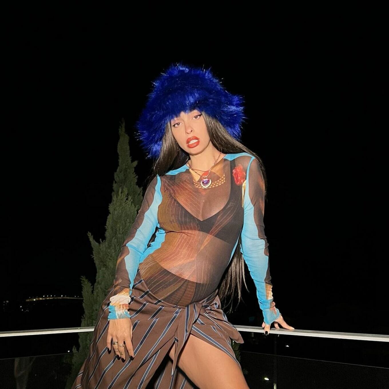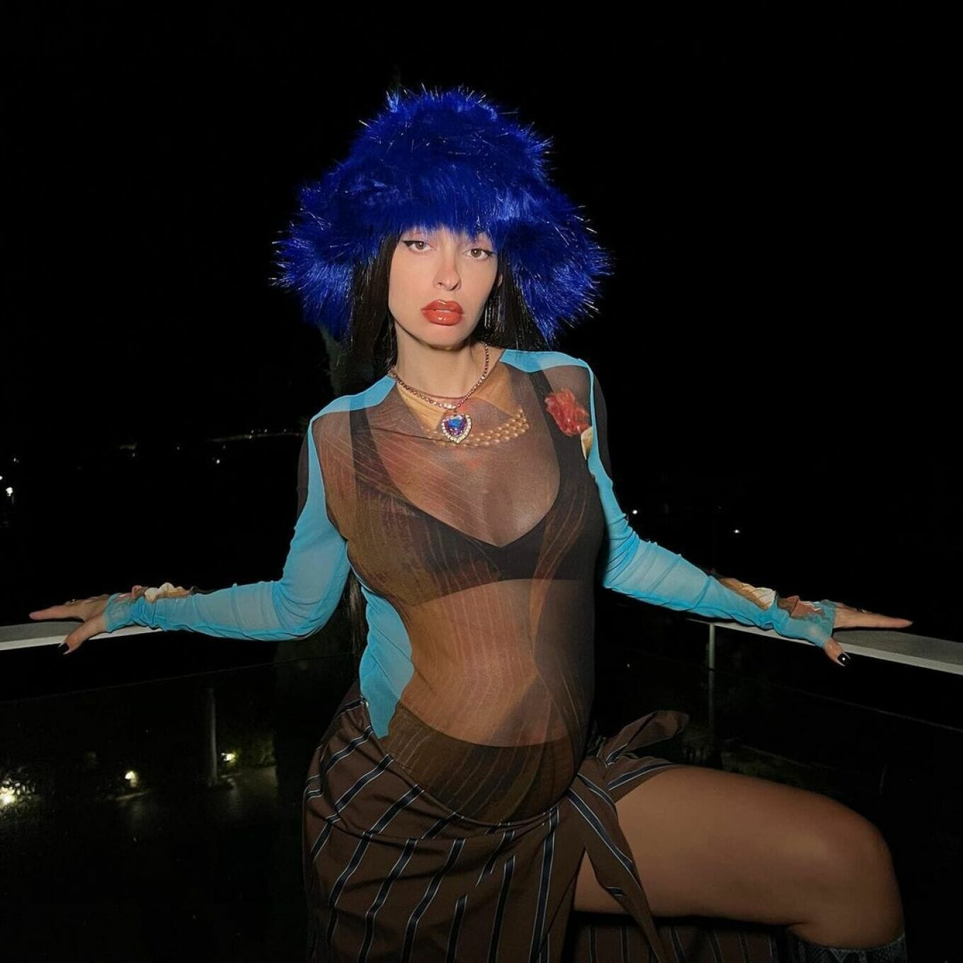 Έτσι, έκανε ανάρτηση στον προσωπικό της λογαριασμό στο Instagram και δημοσίευσε φωτογραφίες της νε μακριά φούστα, μπλε καπέλο και ένα διάφανο κορμάκι, που αφήνει ακάλυπτη την κοιλιά της.