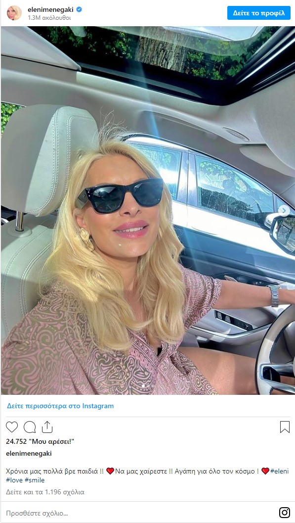 Στις selfies που ανάρτησε, η Ελένη Μενεγάκη χαμογελά πλατιά στον φακό, ενώ φορά μαύρα γυαλιά ηλίου. Σε μία από αυτές, στέλνει ένα φιλί στην κάμερα.