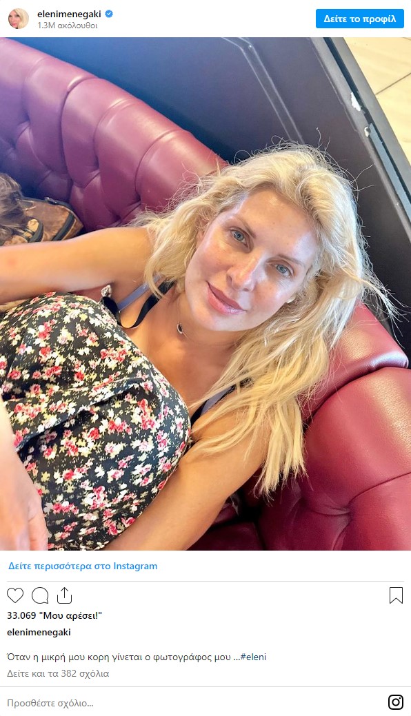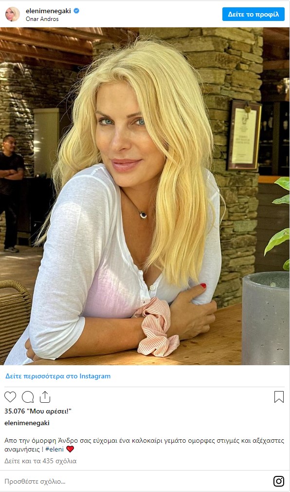 Στις περισσότερες από τις αναρτήσεις της πλέον, η Ελένη Μενεγάκη ποζάρει χωρίς μακιγιάζ. Στην πιο πρόσφατη από αυτές, την 1η Ιουνίου, ανέβασε μια φωτογραφία της, στην οποία φαίνεται να ποζάρει άβαφη στον φακό. Στη λεζάντα έγραψε: «Από την όμορφη Άνδρο σας εύχομαι ένα καλοκαίρι γεμάτο όμορφες στιγμές και αξέχαστες αναμνήσεις!».