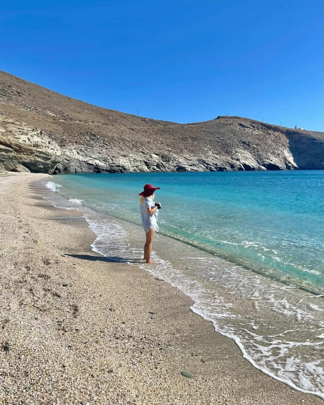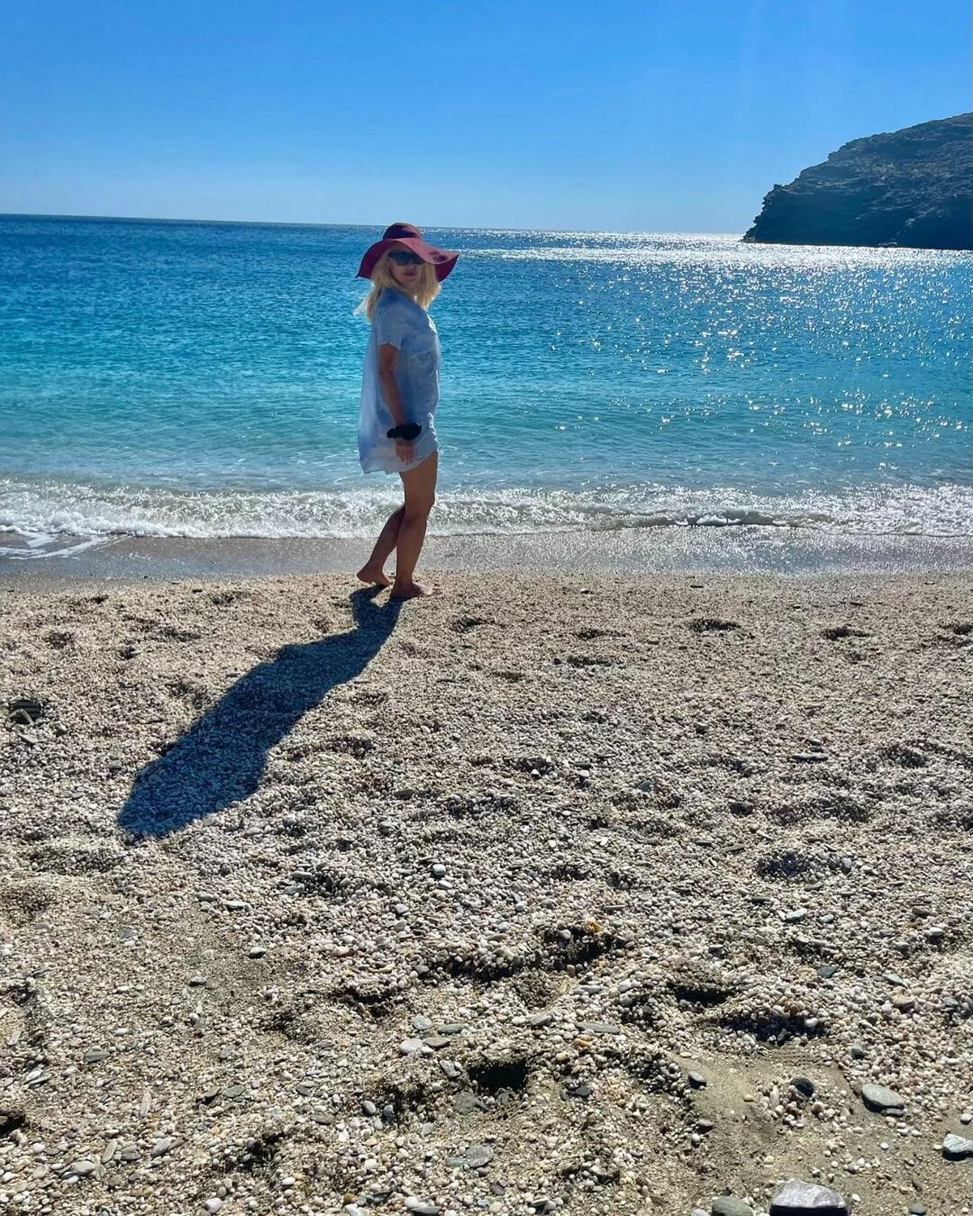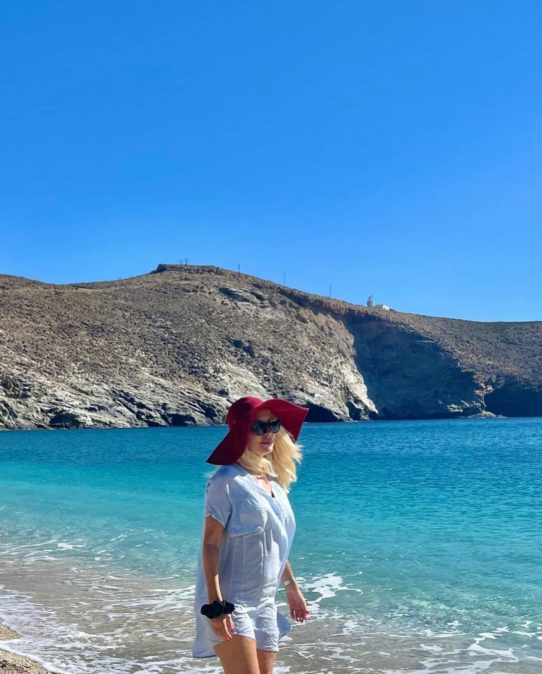 Η ξανθιά παρουσιάστρια φωτογραφίζεται μόνη της σε μία απέραντη παραλία χωρίς κανένας να της χαλάει την ηρεμία και την ησυχία αγναντεύοντας το γαλάζιο του Αιγαίου