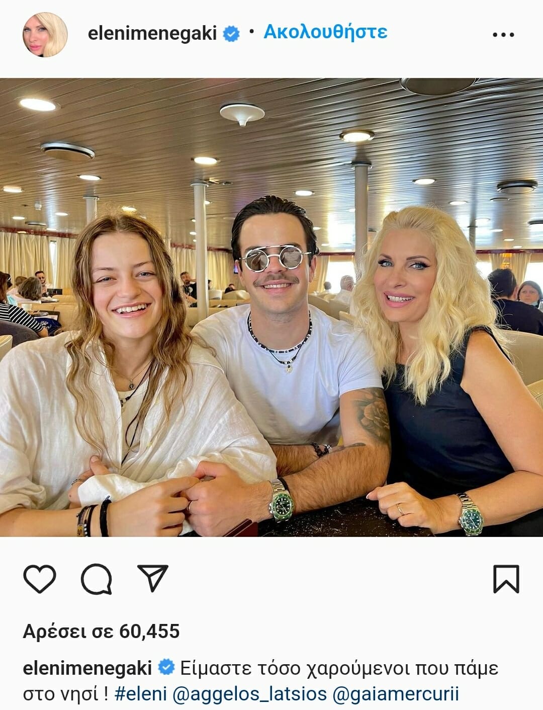 Την πρώτη της φωτογραφία ανέβασε η Ελένη Μενεγάκη μαζί με τον γιο της Άγγελο Λάτσιο και την σύντροφό του Γαία Μερκούρη.