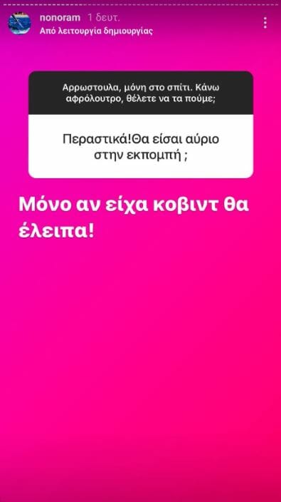 Στις επόμενες ερωτήσεις που δέχτηκε, ανέφερε ότι δεν θα λείπει από την εκπομπή της Πέμπτης. «Μόνο αν είχα covid θα έλειπα», ανέφερε συγκεκριμένα.