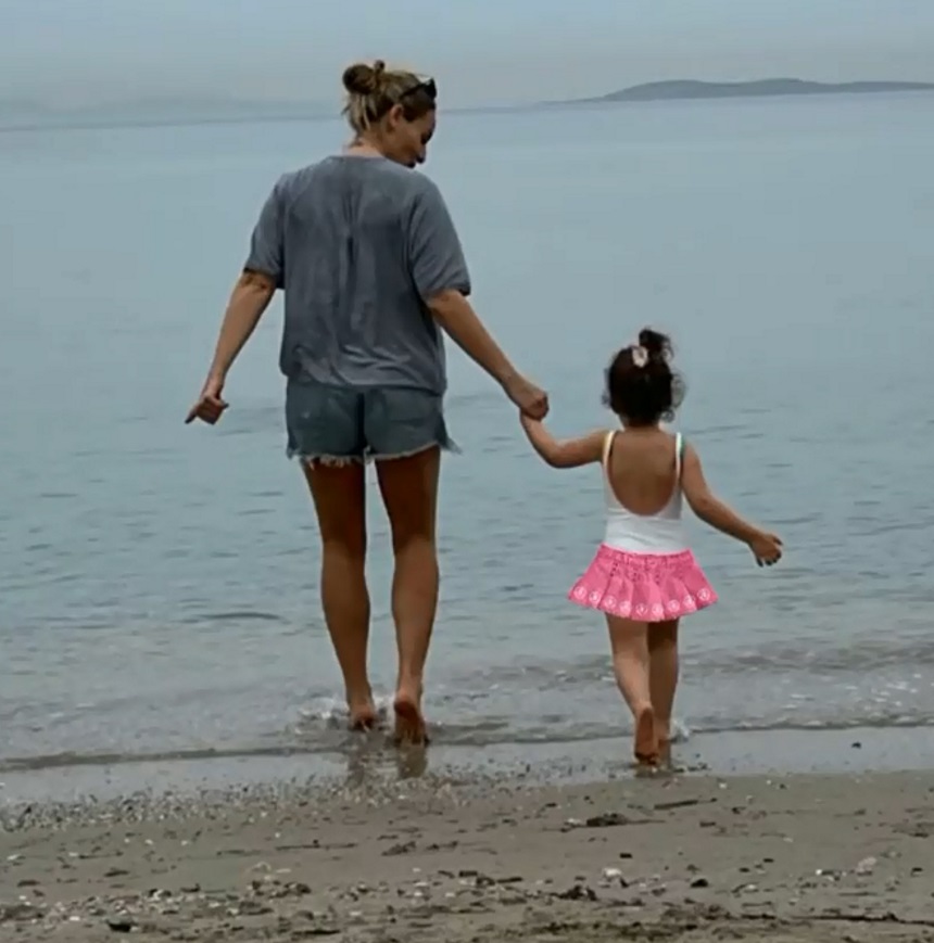 Από τη πλευρό της δεν έλειπε, βέβαια, και η τρίχρονη κόρη της Αλεξάνδρα, η οποία μπορεί να κρύωσε, όμως φάνηκε θαρραλέα και μπήκε στη θάλασσα.