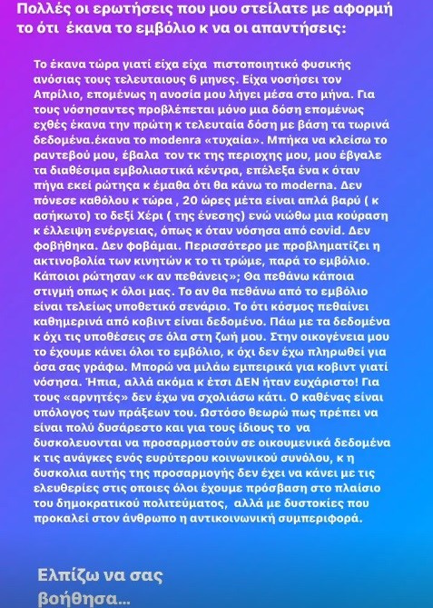 Δεν πόνεσε καθόλου και τώρα, 20 ώρες μετά, είναι βαρύ και ασήκωτο το δεξί χέρι (της ένεσης), ενώ νιώθω μία κούραση και έλλειψη ενέργειας, όπως και όταν νόσησα με Covid. Δεν φοβήθηκα, δεν φοβάμαι. Περισσότερο με προβληματίζει η ακτινοβολία των κινητών και το τι τρώμε, παρά το εμβόλιο. Κάποιοι ρώτησαν “και αν πεθάνεις;”. Θα πεθάνω κάποια στιγμή, όπως και όλοι μας. Το αν πεθάνω από το εμβόλιο, είναι τελείως υποθετικό σενάριο. Το ότι ο κόσμος πεθαίνει καθημερινά από Covid είναι δεδομένο.