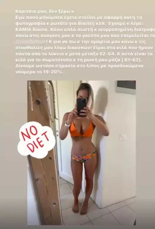 Έτσι, απευθύνθηκε σε εκείνες αναφέροντας στον προσωπικό της λογαριασμό: «Κορίτσια μου δεν ξέρω κι εγώ πόσα μηνύματα έχετε στείλει με αφορμή αυτή τη φωτογραφία και ρωτάτε για δίαιτες κτλ.
