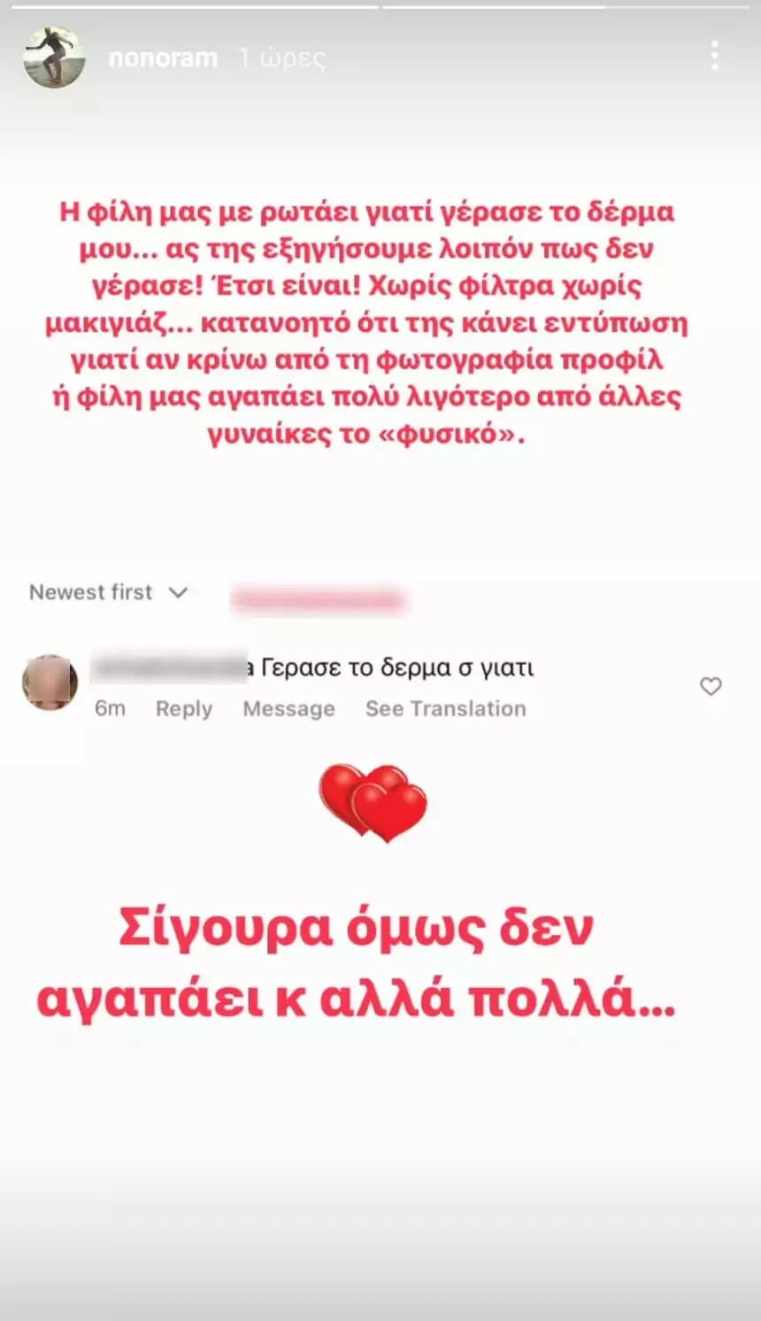 Αντέδρασε γράφοντας το εξής: «Η φίλη μας με ρωτάει γιατί γέρασε το δέρμα μου… Ας της εξηγήσουμε λοιπόν πως δεν γέρασε!