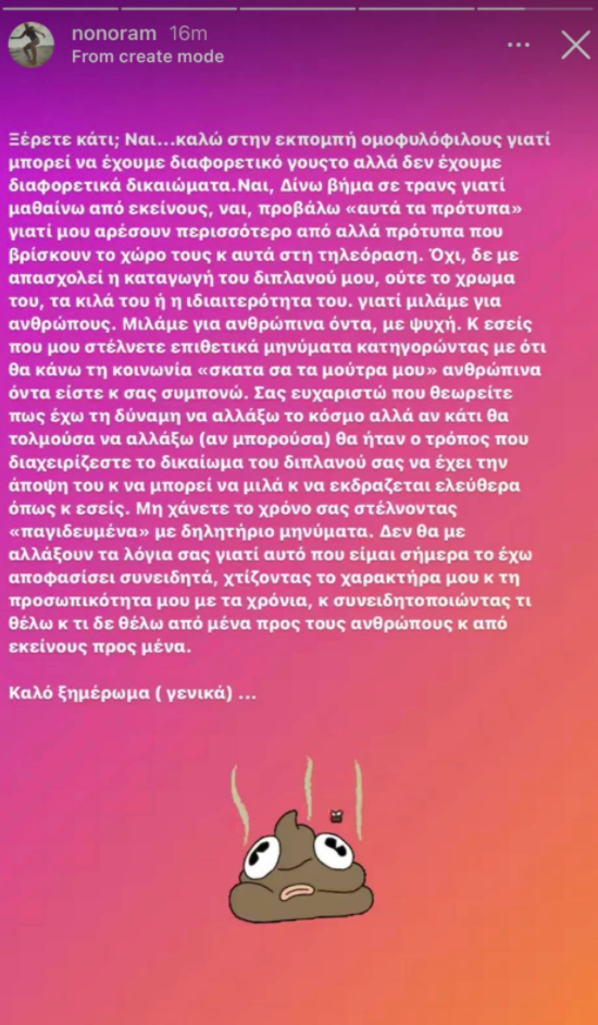 “Ξέρετε κάτι; Ναι, καλώ στην εκπομπή ομοφυλόφιλους γιατί μπορεί να έχουμε διαφορετικό γούστο αλλά δεν έχουμε διαφορετικά δικαιώματα. Ναι, δίνω βήμα σε τρανς γιατί μαθαίνω από εκείνους. Ναι, προβάλλω “αυτά τα πρότυπα” γιατί μου αρέσουν περισσότερο από άλλα πρότυπα που βρίσκουν το χώρο τους κι αυτά στην τηλεόραση.