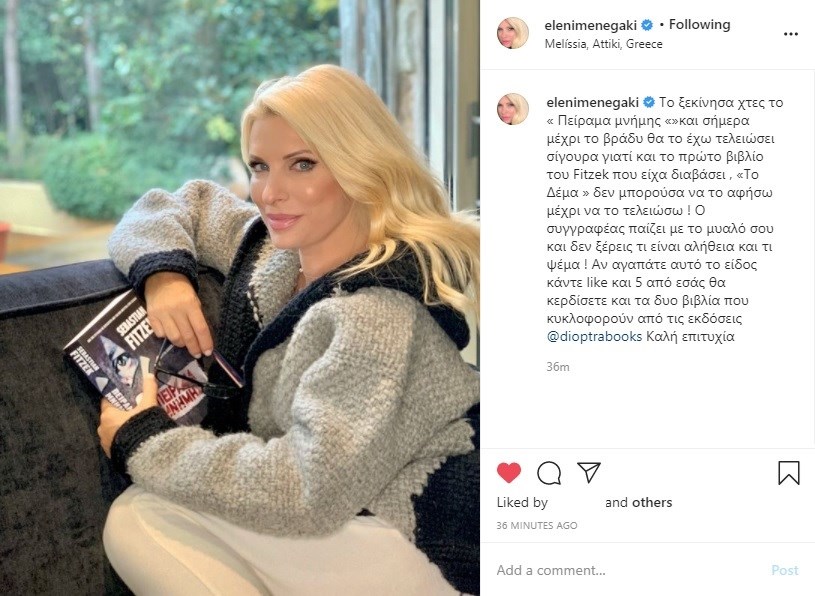 Φορώντας ένα ζεστό πανωφόρι, η Ελένη Μενεγάκη κάθεται στον καναπέ του σπιτιού της που βρίσκεται δίπλα στο παράθυρο και διαβάζει το «Πείραμα μνήμης» του Sebastian Fitzek -που κυκλοφορεί από τη Διόπτρα- για τον οποίο εξομολογείται ότι μπορεί και παίζει με το… μυαλό της, έγραψε χαρακτηριστικά στον προσωπικό της λογαριασμό στο instagram.