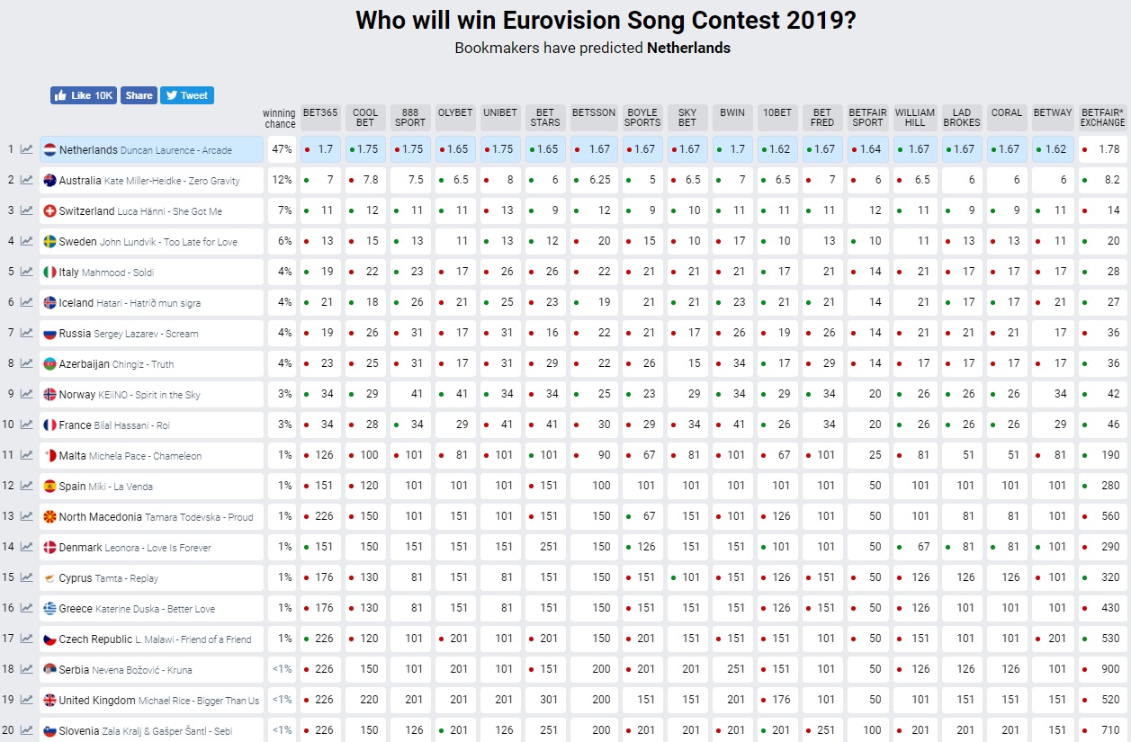 Ένα θρίλερ ζουν οι υποψήφιες χώρες, αφού τα σκαμπανεβάσματα είναι το… κυρίως πιάτο για bookers και παίκτες. Στο διά ταύτα. Ενώ μέχρι πριν λίγη ώρα η Κύπρος φαινόταν να κερδίζει έδαφος, αυτή τη στιγμή η Τάμτα και η Κατερίνα Ντούσκα βρίσκονται αντίστοιχα στην 15η και τη 16η θέση.