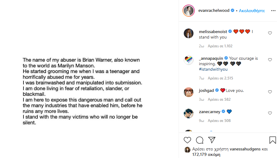 Με μία αποκαλυπτική ανάρτηση στο Instagram η Έβαν Ρέιτσελ Γουντ κατονόμασε τον Μέριλιν Μάνσον, πρώην σύντροφό της, για κακοποίηση, βιασμό και εκφοβισμό.