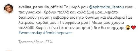 «Το μωρό μου @aphrodite_liantou είναι πια γυναίκα!! Χρόνια πολλά και καλά ζωή μου…γεμάτα δικαιοσύνη αγάπη σεβασμό ισότητα δύναμη και ελευθερία ! Σε λατρεύω καρδιά μου!! Περηφάνια μου ! Μαμά μου χρόνια πολλά!!!! Χωρίς εσένα ( και τον μπαμπά ) δεν θα υπήρχαμε».
