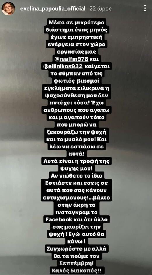 «Μέσα σε μικρότερο διάστημα ενός μηνός έγινε εμπρηστική ενέργεια στον χώρο εργασίας μας @realfm978 και @ellinikos932 καίγεται το σύμπαν από τις φωτιές, βιασμοί εγκλήματα ειλικρινά η ψυχοσύνθεσή μου δεν αντέχει τόσα!