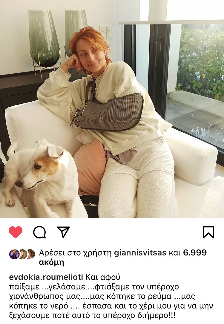 «Και αφού παίξαμε …γελάσαμε …φτιάξαμε τον υπέροχο χιονάνθρωπος μας….μας κόπηκε το ρεύμα …μας κόπηκε το νερό …. έσπασα και το χέρι μου για να μην ξεχάσουμε ποτέ αυτό το υπέροχο διήμερο!». Έγραψε κάτω από την φωτογραφία της.