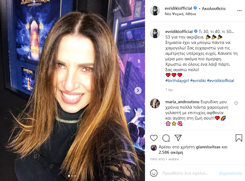 Η Ευρυδίκη θέλησε να μοιραστεί με τους ακόλουθούς της στον προσωπικό της λογαριασμό στο instagram, χαρούμενες στιγμές από την ημέρα των γενεθλίων της.
