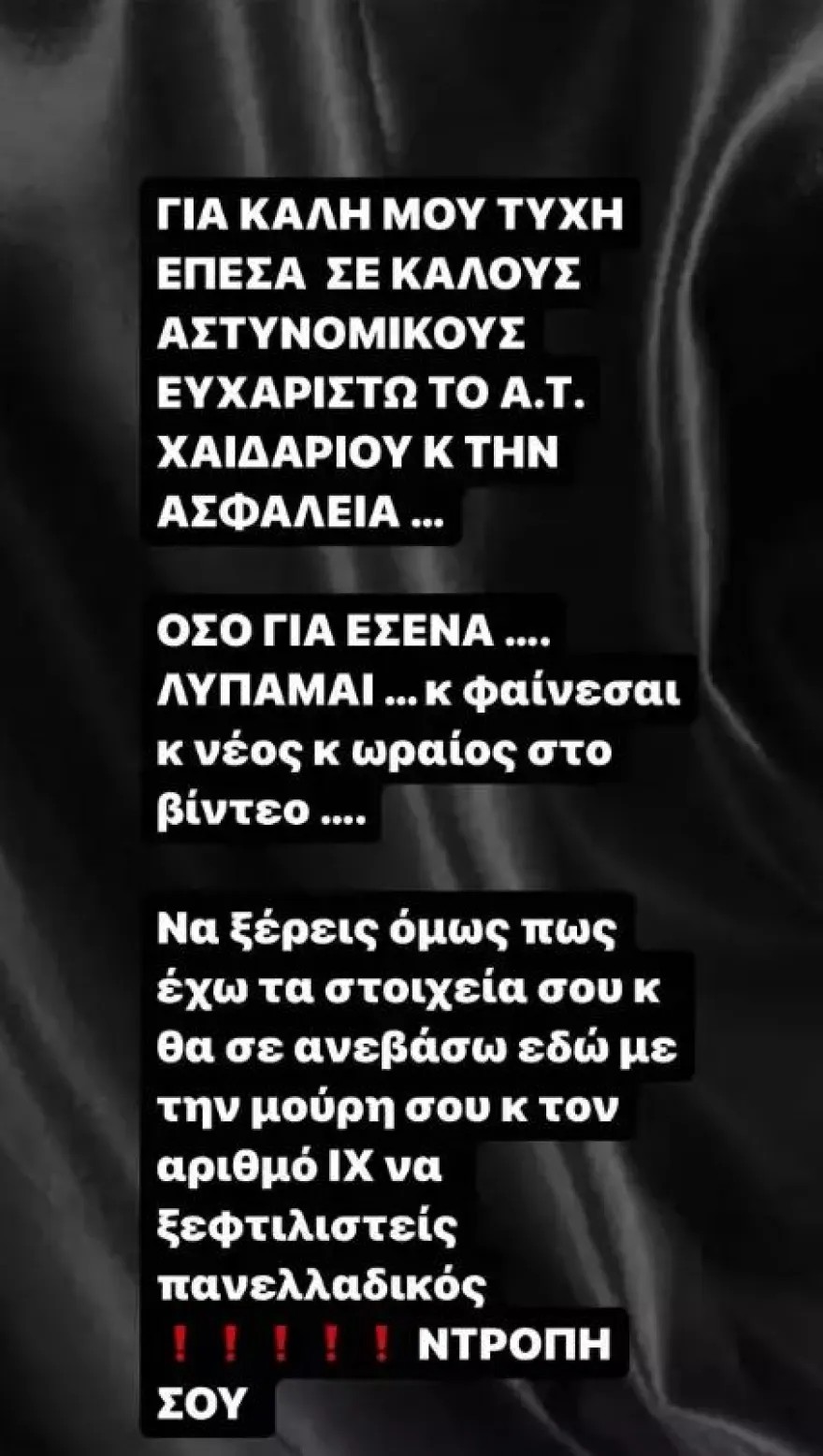 «Για καλή μου τύχη, έπεσα σε καλούς αστυνομικούς. Ευχαριστώ το Α.Τ Χαϊδαρίου και την Ασφάλεια. Όσο για σένα, λυπάμαι και φαίνεσαι και νέος και ωραίος στο βίντεο. Να ξέρεις όμως πως έχω τα στοιχεία σου και θα σε ανεβάσω εδώ με τη μούρη σου και τον αριθμό Ι.Χ σου να ξεφτυλιστείς πανελλαδικώς. Ντροπή σου».