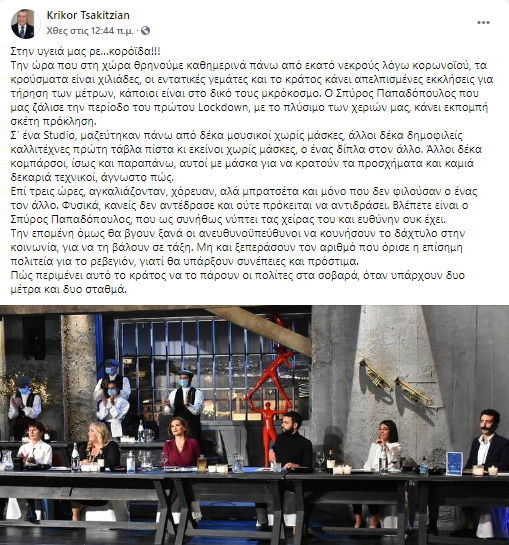 Αιτία, το γεγονός πως οι επώνυμοι καλεσμένοι εμφανίζονται στην πρώτη σειρά χωρίς να φορούν μάσκα και χωρίς να κρατούν τις απαραίτητες αποστάσεις, κάτι -που σύμφωνα με τον ίδιο- πάει κόντρα σε όσα συμβούλευε ο Παπαδόπουλος στο σποτ «Μένουμε Σπίτι».