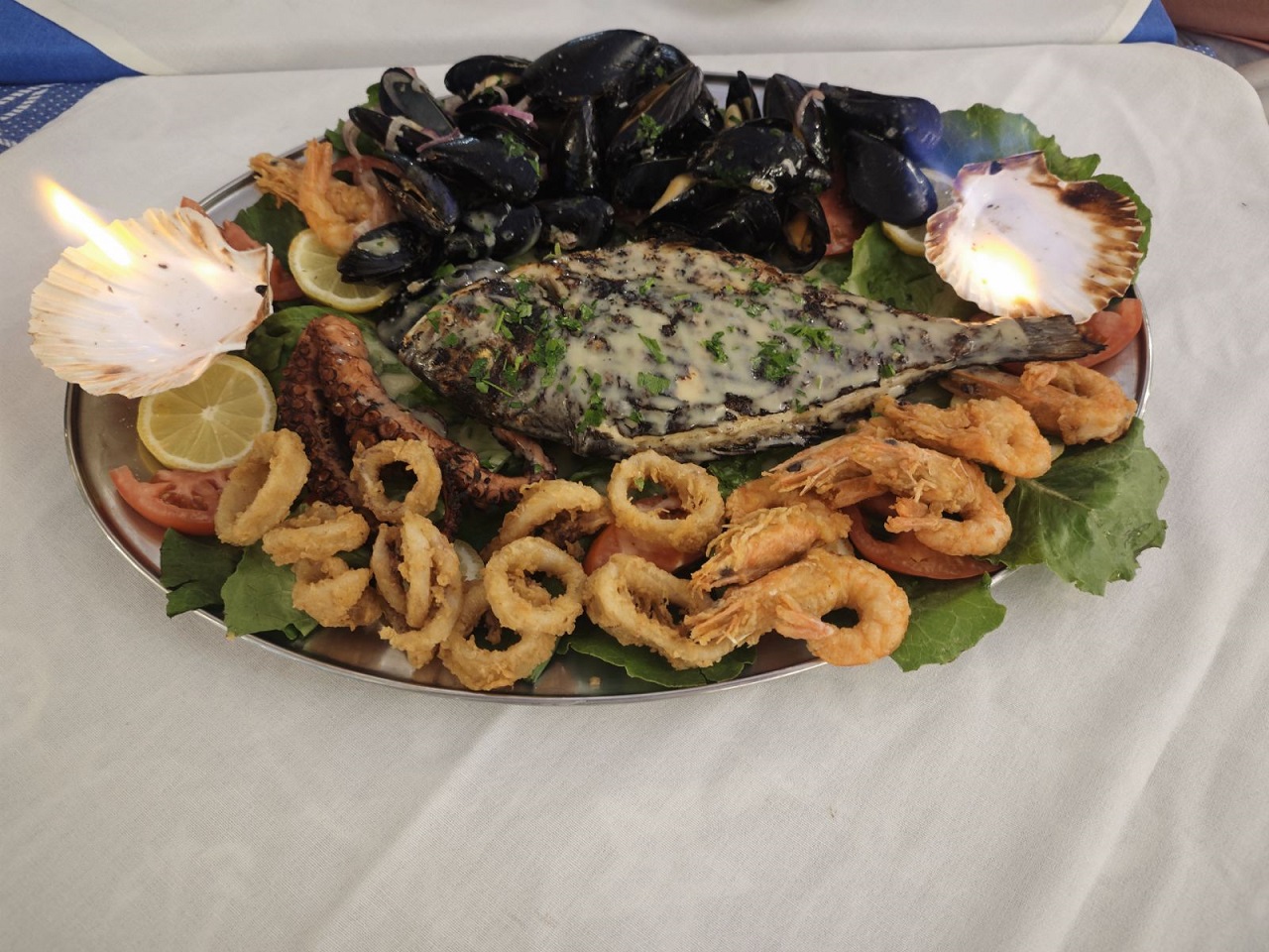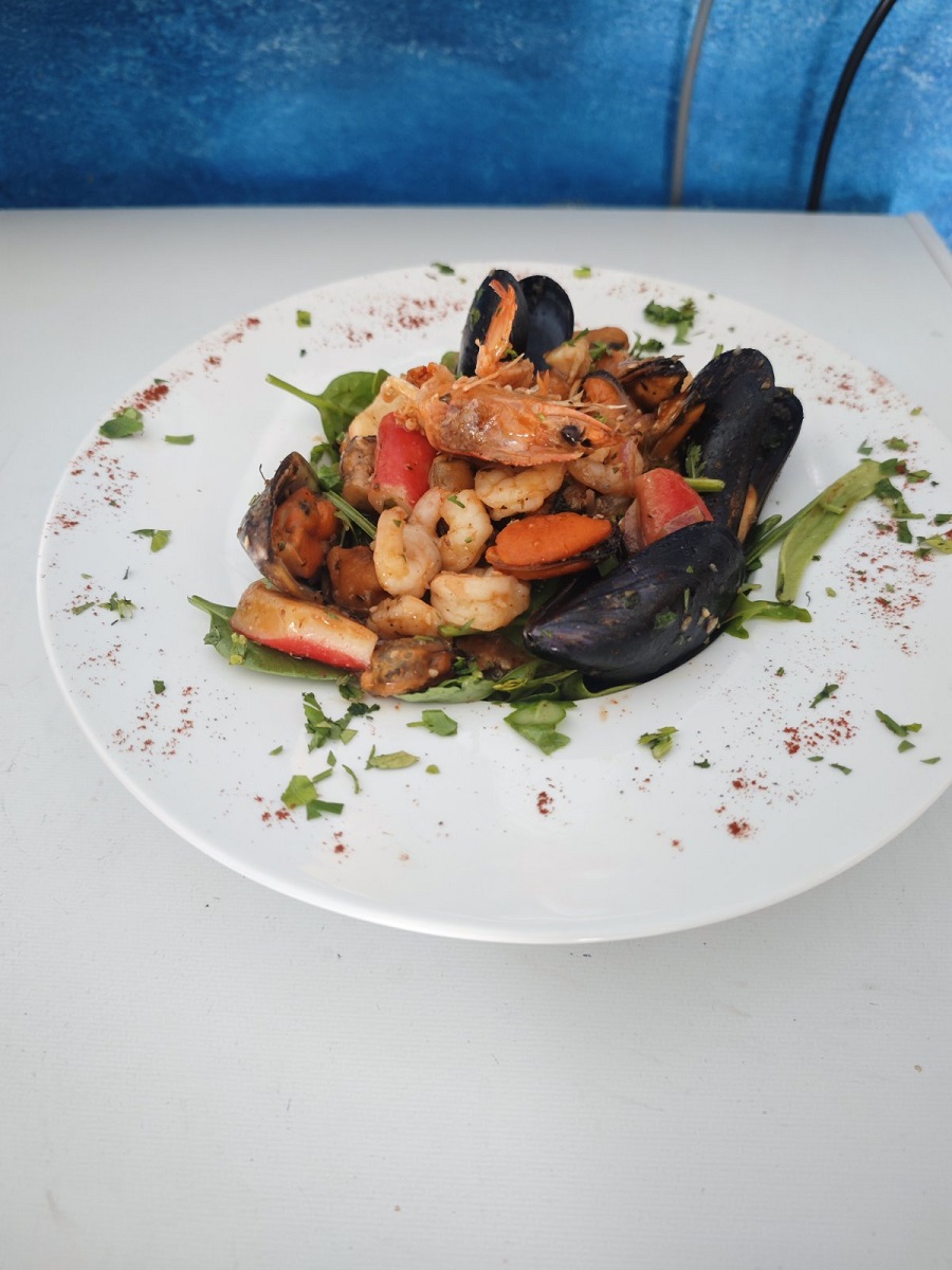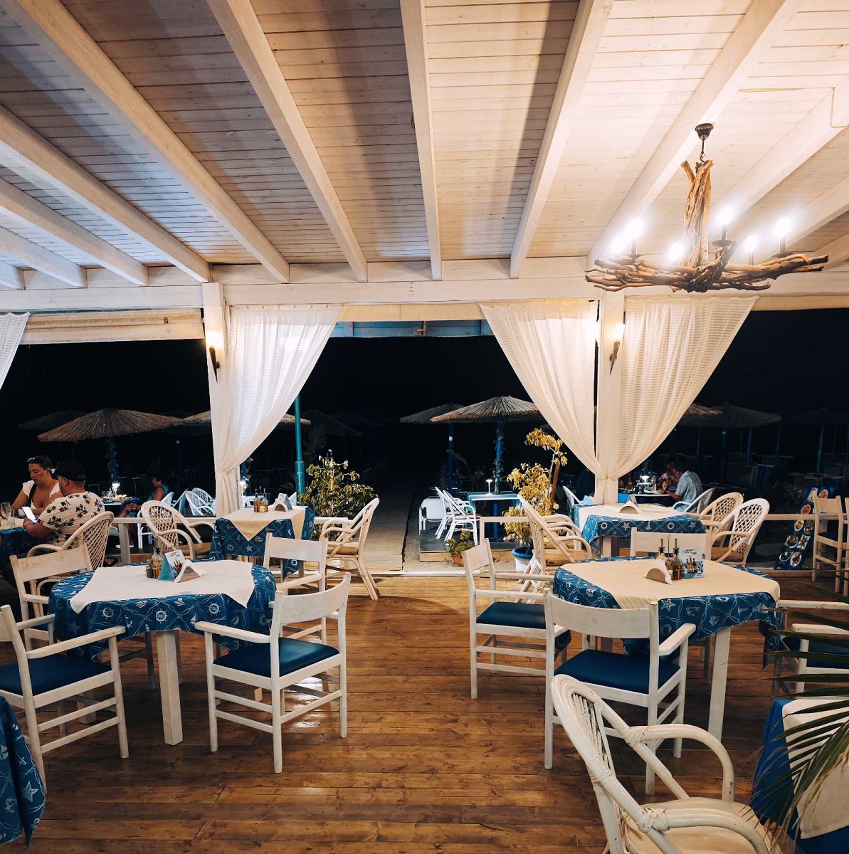 Κατά τη διάρκεια της ημέρας, απολαύστε γεύσεις θαλασσινών σε ένα γαλήνιο περιβάλλον με θέα το απέραντο γαλάζιο. Το μενού περιλαμβάνει επίσης πίτσα, παραδοσιακά ορεκτικά και πλούσιες επιλογές πιάτων τόσο κρεατικών όσο και θαλασσινών, ενώ το βράδυ απολαύστε δροσερά κοκτέιλ.