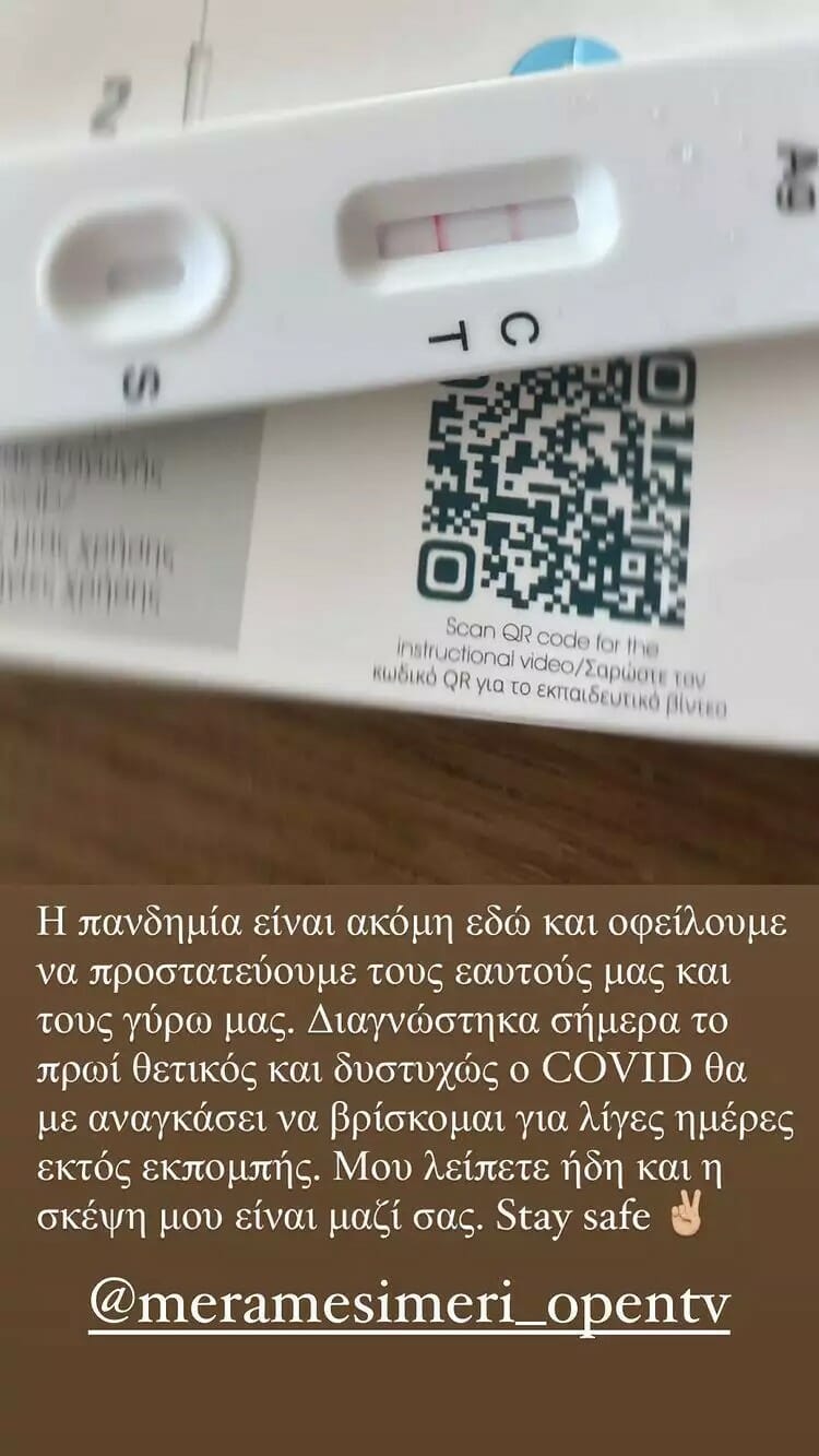 «Η πανδημία είναι ακόμα εδώ και οφείλουμε να προστατεύουμε τους εαυτούς μας και τους γύρω μας. Διαγνωστικά σήμερα το πρωί θετικός και δυστυχώς ο COVID θα με αναγκάσει να βρίσκομαι για λίγες ημέρες εκτός εκπομπής. Μου λείπετε ήδη και η σκέψη μου είναι μαζί σας. Stay safe».