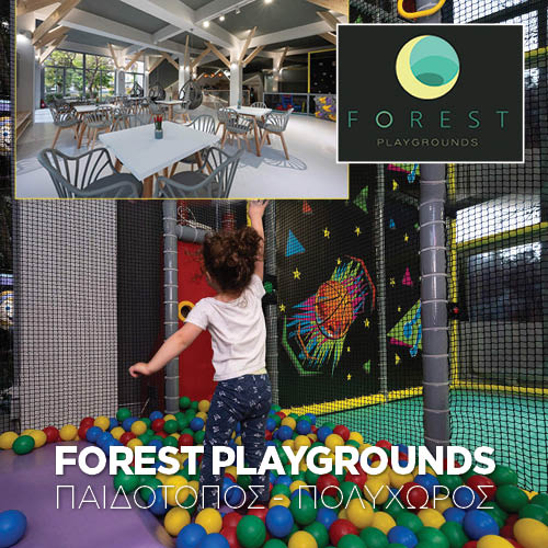 Το Forest Playgrounds είναι κάτι παραπάνω από ένας παιδότοπος. Είναι ένας πολυχώρος χαράς για μικρούς και μεγάλους. Οι χώροι, είναι διαμορφωμένοι σύμφωνα με τα ενδιαφέρονται των παιδιών ώστε αυτά να διασκεδάσουν. Δίπλα στον παιδότοπο το υπέροχο cafe υποδέχεται τους γονείς που μπορούν να απολαύσουν τη μέρα τους την ώρα που τα παιδιά χαίρονται το παιχνίδι με την καρδιά τους. Εκτός από καφέ μπορούν να απολαύσουν γλυκό και φαγητό (ομελέτες, πίτσα, club sandwich, burger, σαλάτες κ.ά), αλλά και ποτό το βράδυ.