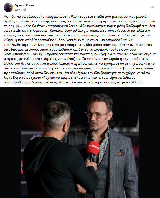 «Λοιπόν για να βάζουμε τα πράγματα στην θέση τους και επειδή μου μεταφέρθηκαν μερικά σχόλια, από πάνελ εκπομπής που τους έδωσα και συνέντευξη πρόσφατα και συγκεκριμένα από το Pop up…