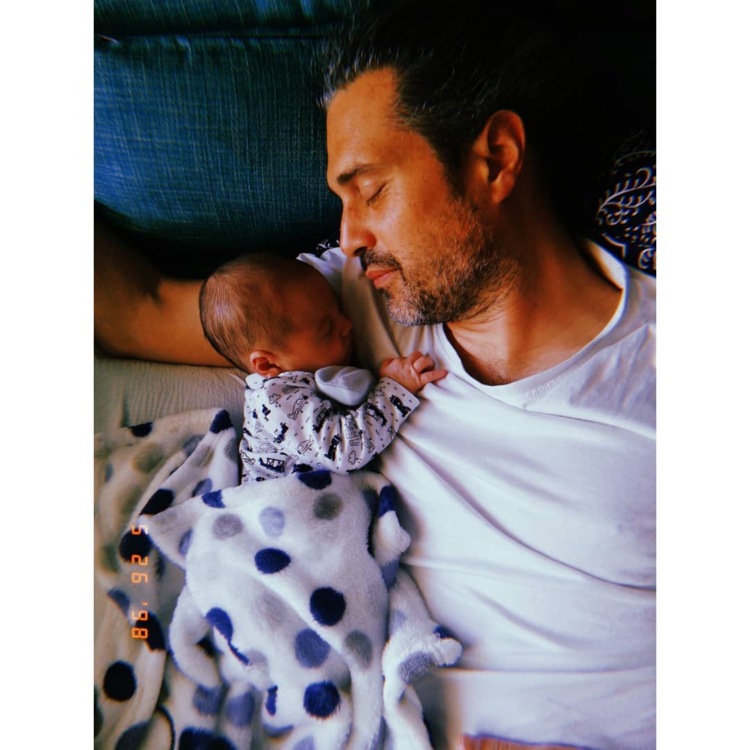 Δημοσιεύοντας μια φωτογραφία του συζύγου της Γιώργου Πενταφράγκα να κοιμάται έχοντας στην αγκαλιά του τον νεογέννητο γιο τους.