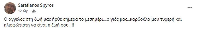 «Ο άγγελος στη ζωή μας ήρθε σήμερα το μεσημέρι….ο γιός μας…καρδούλα μου τυχερή και ηλιοφώτιστη να είναι η ζωή σου..!!!» έγραψε ο Σπύρος Σαραφιανός στον προσωπικό του λογαριασμό.