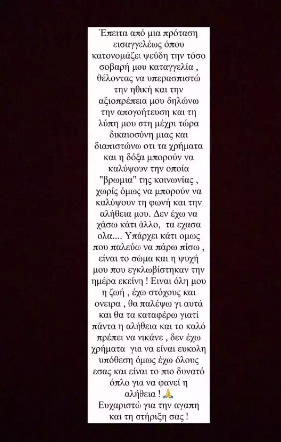 «Έπειτα από μια πρόταση εισαγγελέως όπου κατονομάζει ψεύδη την τόσο σοβαρή μου καταγγελία, θέλοντας να υπερασπιστώ την ηθική και την αξιοπρέπειά μου δηλώνω την απογοήτευση και τη λύπη μου στη μέχρι τώρα δικαιοσύνη, μιας και διαπιστώνω ότι τα χρήματα και η δόξα μπορούν να καλύψουν την όποια ‘”βρωμιά” της κοινωνίας, χωρίς όμως να μπορούν να καλύψουν τη φωνή και την αλήθεια μου. Δεν έχω να χάσω κάτι άλλο, τα έχασα όλα…